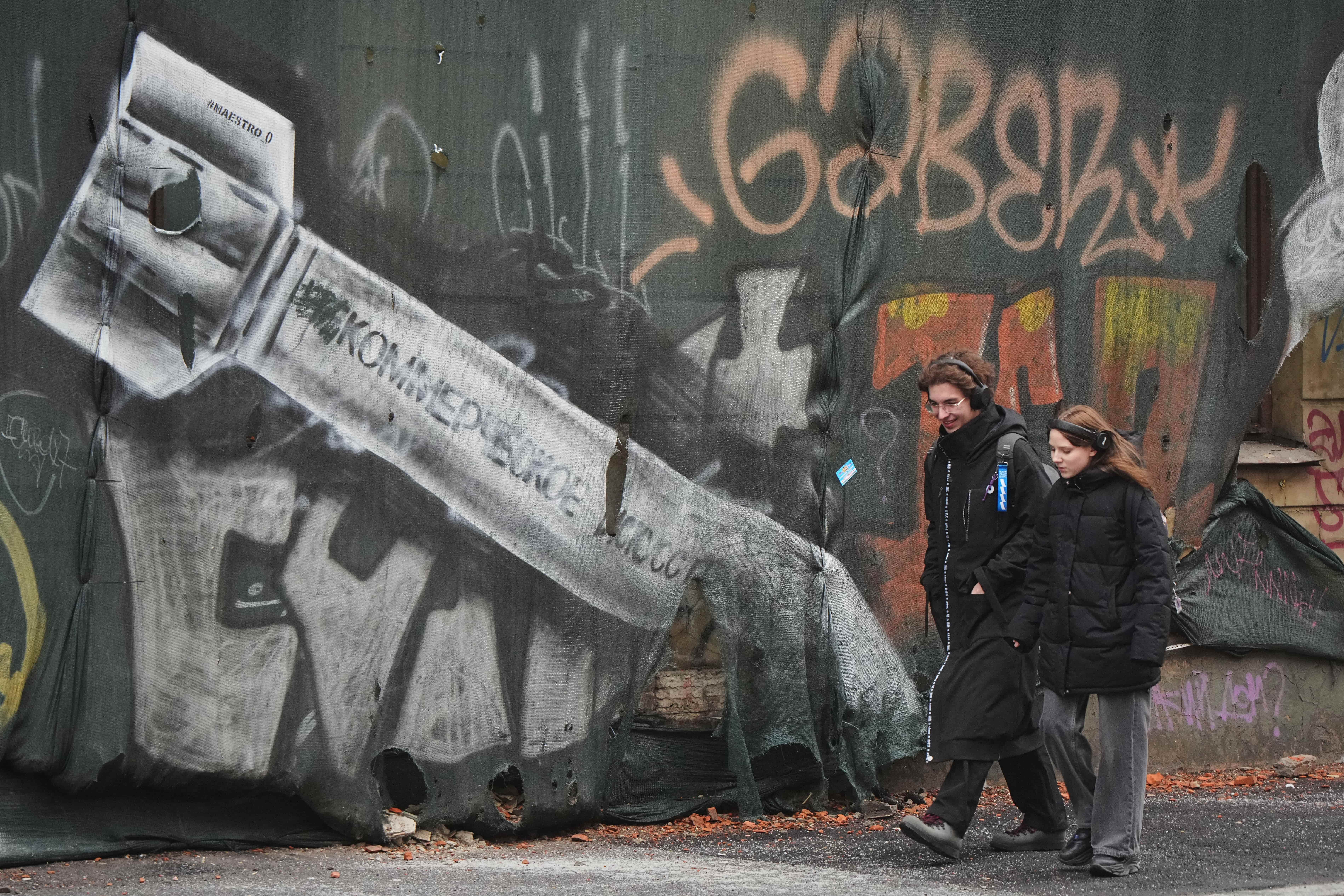 A couple walk past a graffiti depicting a falling missile with the inscription 'Non-commercial art', painted on the mesh covering of a building under renovation in St Petersburg, Russia, March 3, 2026. (PHOTO / AP)