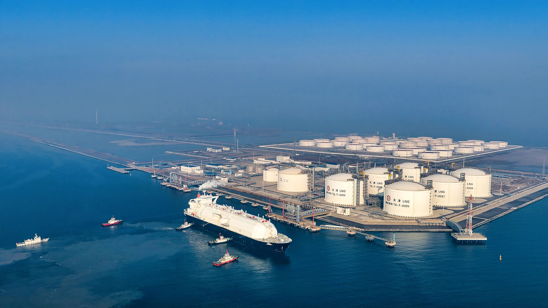 An aerial image captures an LNG vessel docking at a port in Tianjin on Jan 5, 2026. (PHOTO / XINHUA)