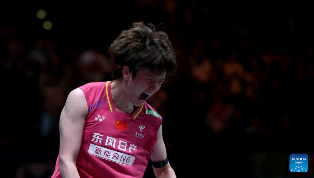 Wang Zhiyi reacts after winning the women's singles final between Wang Zhiyi of China and An Se-young of South Korea at the All England Open Badminton Championships 2026 in Birmingham, Britain, March 8, 2026. (PHOTO / XINHUA)