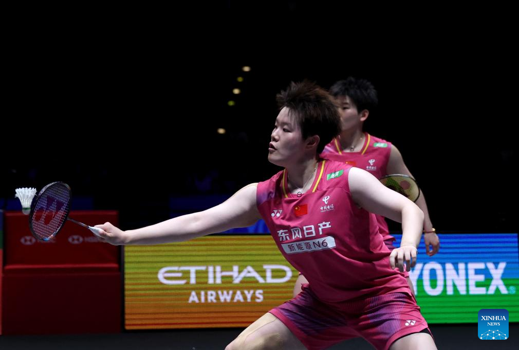 Liu Shengshu(left)/Tan Ning compete during the women's doubles final between Liu Shengshu/Tan Ning of China and Baek Ha-na/Lee So-hee of South Korea at the All England Open Badminton Championships 2026 in Birmingham, Britain, March 8, 2026. (PHOTO / XINHUA)