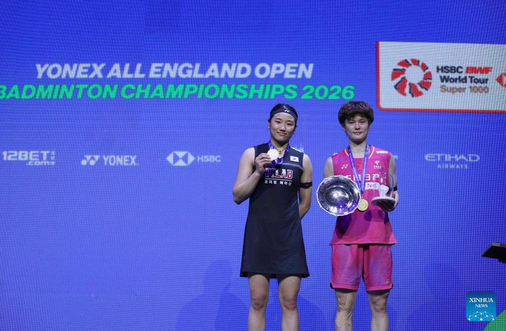 Wang Zhiyi (right) and An Se-young pose at the awarding ceremony for the women's singles final between Wang Zhiyi of China and An Se Young of South Korea at the All England Open Badminton Championships 2026 in Birmingham, Britain, March 8, 2026. (PHOTO / XINHUA)