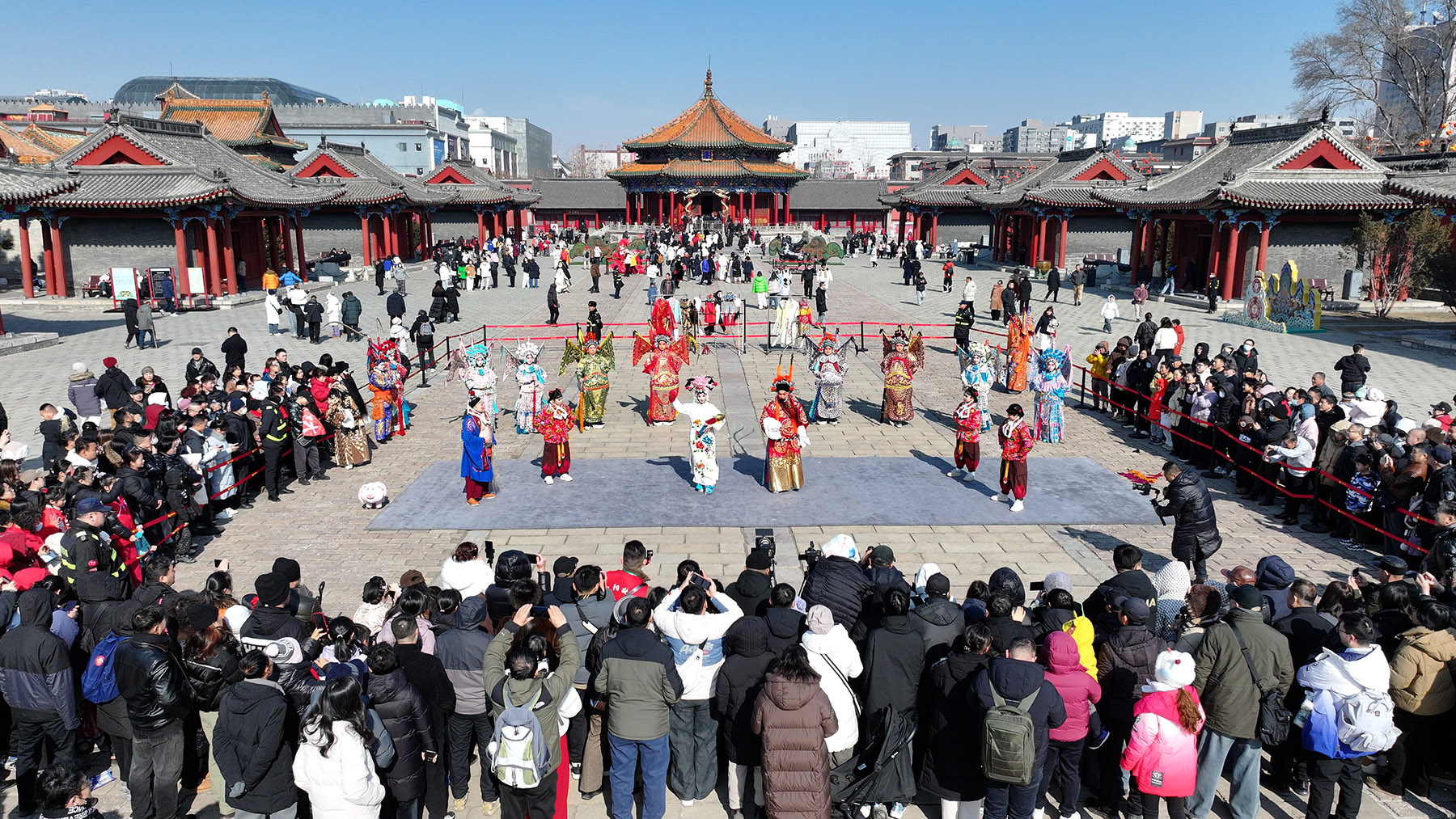 Tourists watch a traditional Peking Opera performance at the square along the Shenyang Imperial Palace in Shenyang, Liaoning province, on Feb 17, 2026. The city, once known primarily as an industrial city, has now become a booming tourist destination. (ZHANG WENKUI / FOR CHINA DAILY)