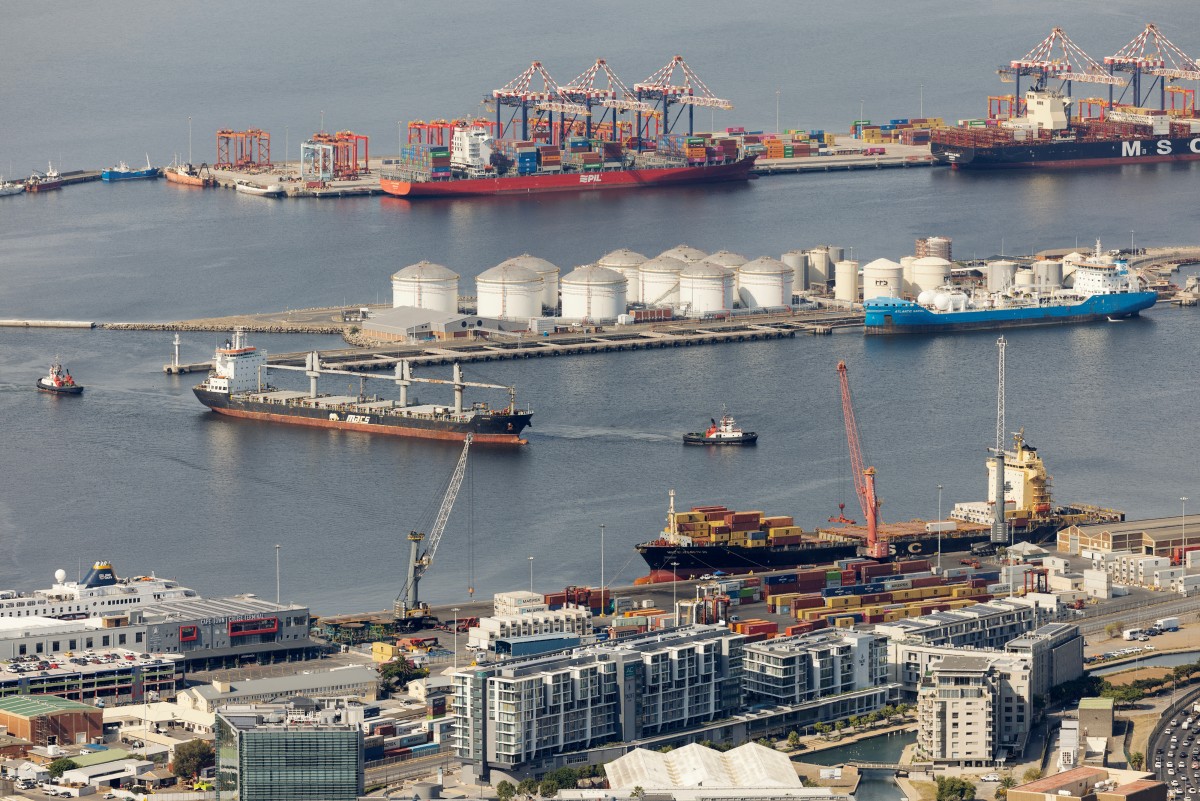 A tugboat navigates a cargo vessel in the harbour in Cape Town, capital of South Africa, March 11, 2026. (PHOTO / AFP)