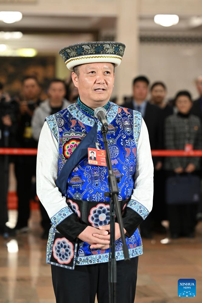Wang Guodong, a deputy to the 14th National People's Congress (NPC), attends a group interview ahead of the closing meeting of the fourth session of the 14th NPC at the Great Hall of the People in Beijing, capital of China, March 12, 2026. (PHOTO / XINHUA)