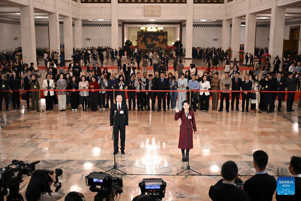 Deputies to the 14th National People's Congress (NPC) attend a group interview ahead of the closing meeting of the fourth session of the 14th NPC at the Great Hall of the People in Beijing, capital of China, March 12, 2026. (PHOTO / XINHUA)