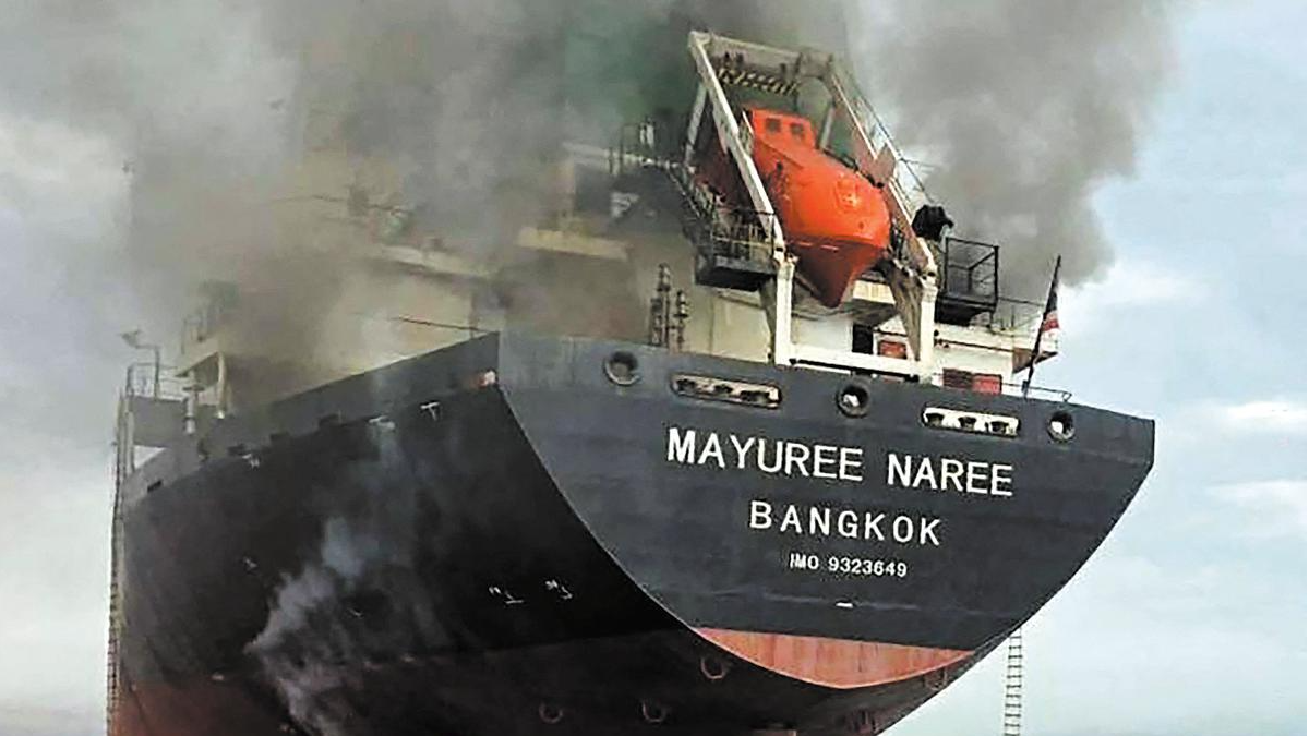 This handout photo taken on March 11, 2026 and released by the Royal Thai Navy shows smoke rising from the Thai bulk carrier 'Mayuree Naree' near the Strait of Hormuz after an attack. A Thai bulk carrier travelling in the crucial Strait of Hormuz was attacked March 11, with 20 crew members rescued so far, the Thai navy said. (HANDOUT / ROYAL THAI NAVY / AFP)