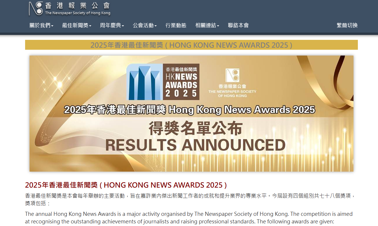 The annual Hong Kong News Awards, organized by The Newspaper Society of Hong Kong, presented 78 prizes this year.