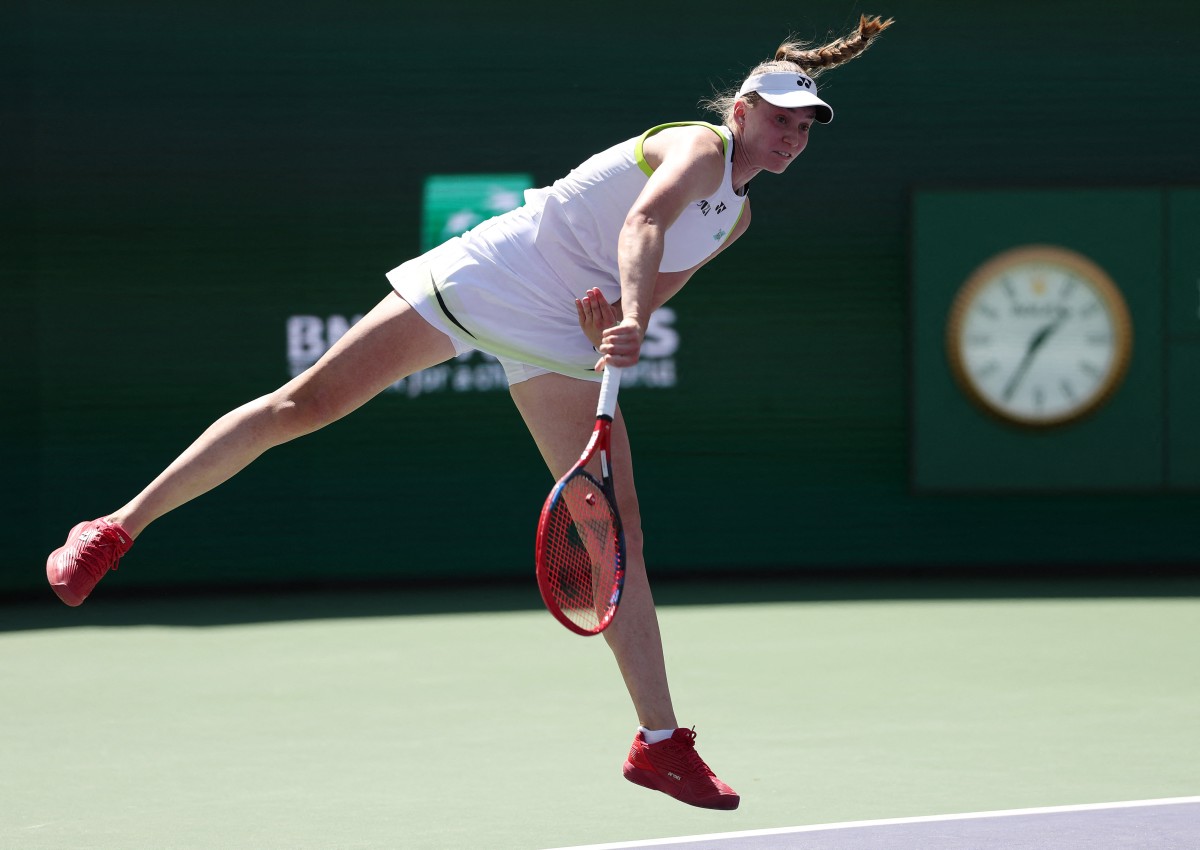Elena Rybakina of Kazakhstan serves against Aryna Sabalenka during their Women's Singles Finals match on Day 12 of the BNP Paribas Open at Indian Wells Tennis Garden on March 15, 2026 in Indian Wells, California. (PHOTO / AFP)