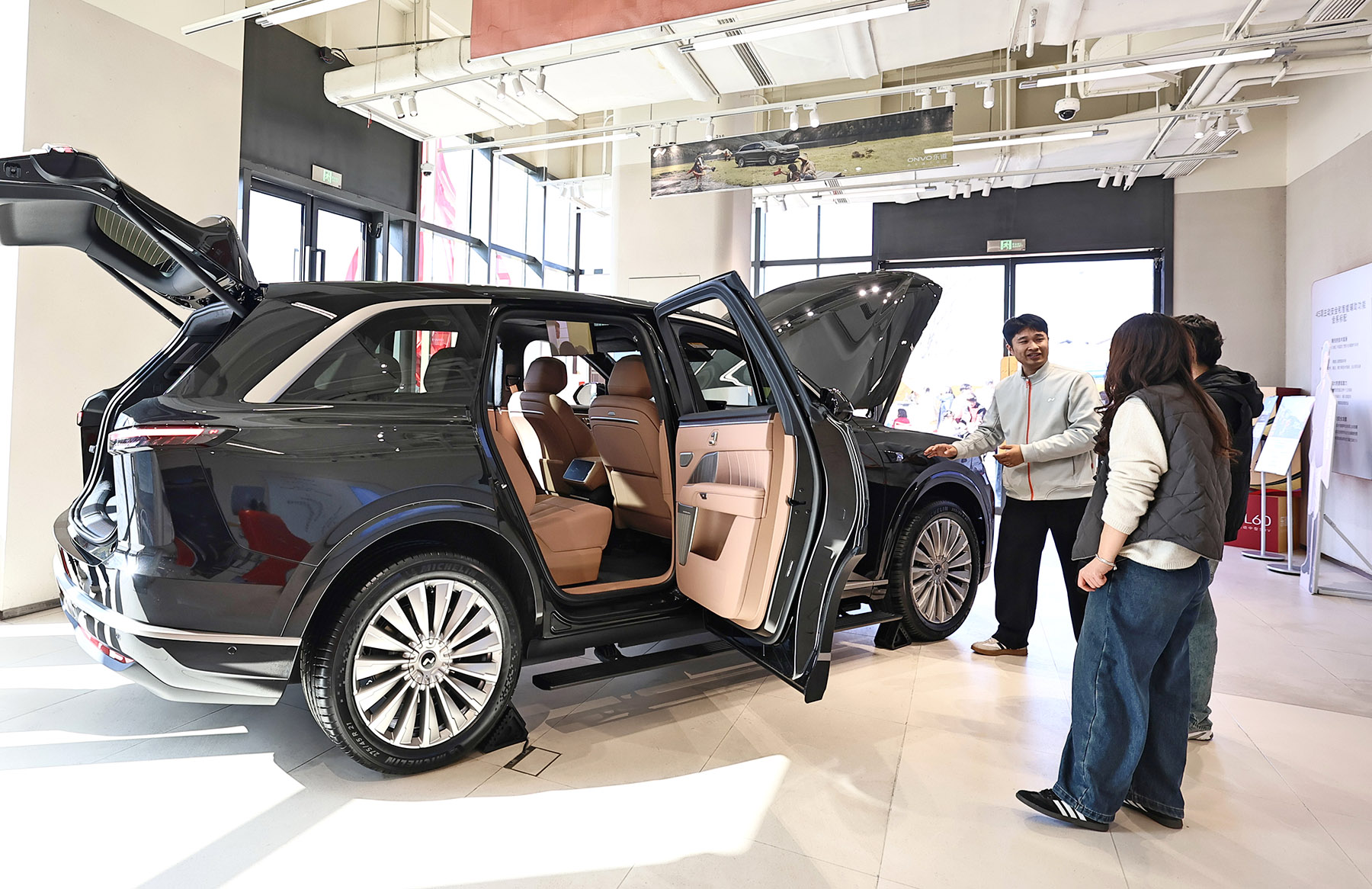 Customers shop for a new energy vehicle at an auto dealership in Nanhu district, Jiaxing, Zhejiang province, on Feb 21, 2026. A series of "Spring Festival Renewal" consumption promotion campaigns launched by major home appliance stores and car dealerships across Jiaxing have attracted a large number of consumers. (JIN PENG / FOR CHINA DAILY)