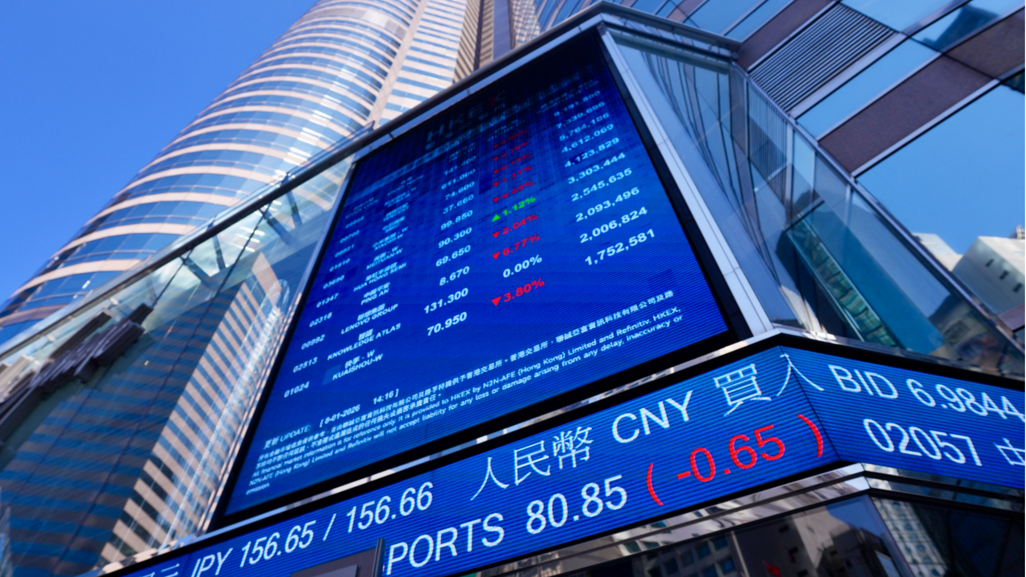 Electronic ticker board outside the Hong Kong Exchanges and Clearing Limited in Central on Jan 8, 2026. (ADAM LAM / CHINA DAILY)