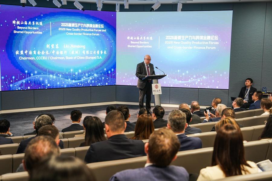 Liu Jiandong, chairman of the China Chamber of Commerce to the EU, speaks at the 2026 New Quality Productive Forces and Cross-border Finance Forum held in Luxembourg on March 24, 2026. (PHOTO/XINHUA)