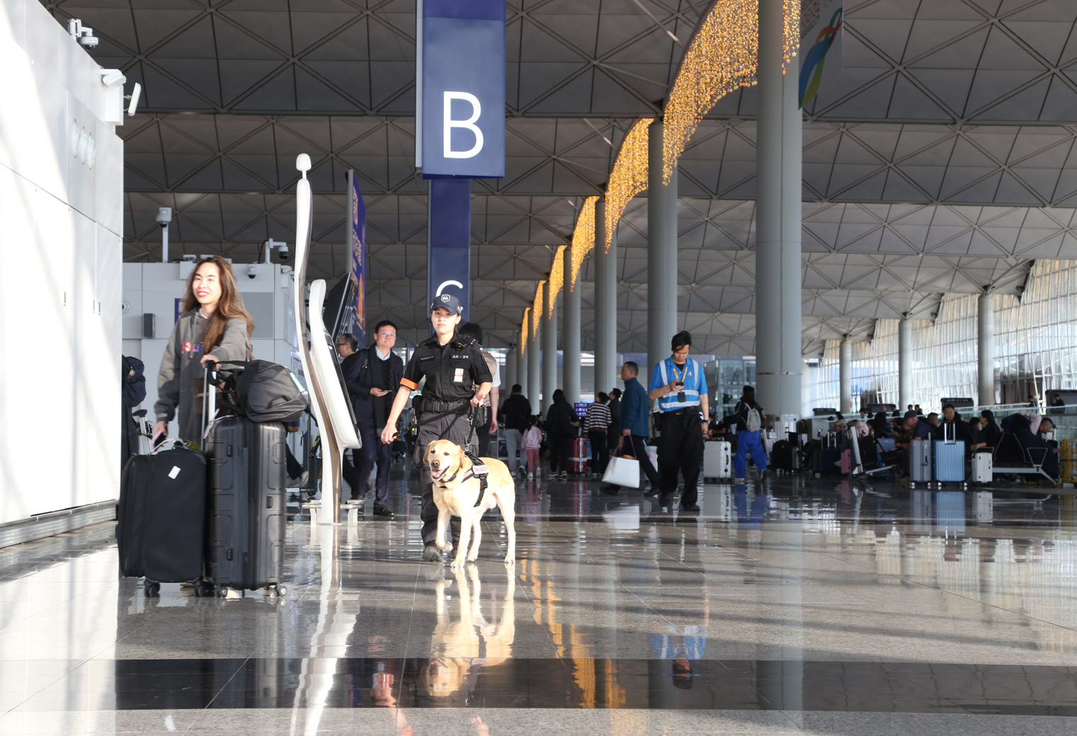 A security official with a sniffer dog is seen as outgoing passengers arrive at the Hong Kong International Airport to catch their flights on Jan 14, 2026. (SHAMIM ASHRAF / CHINA DAILY)