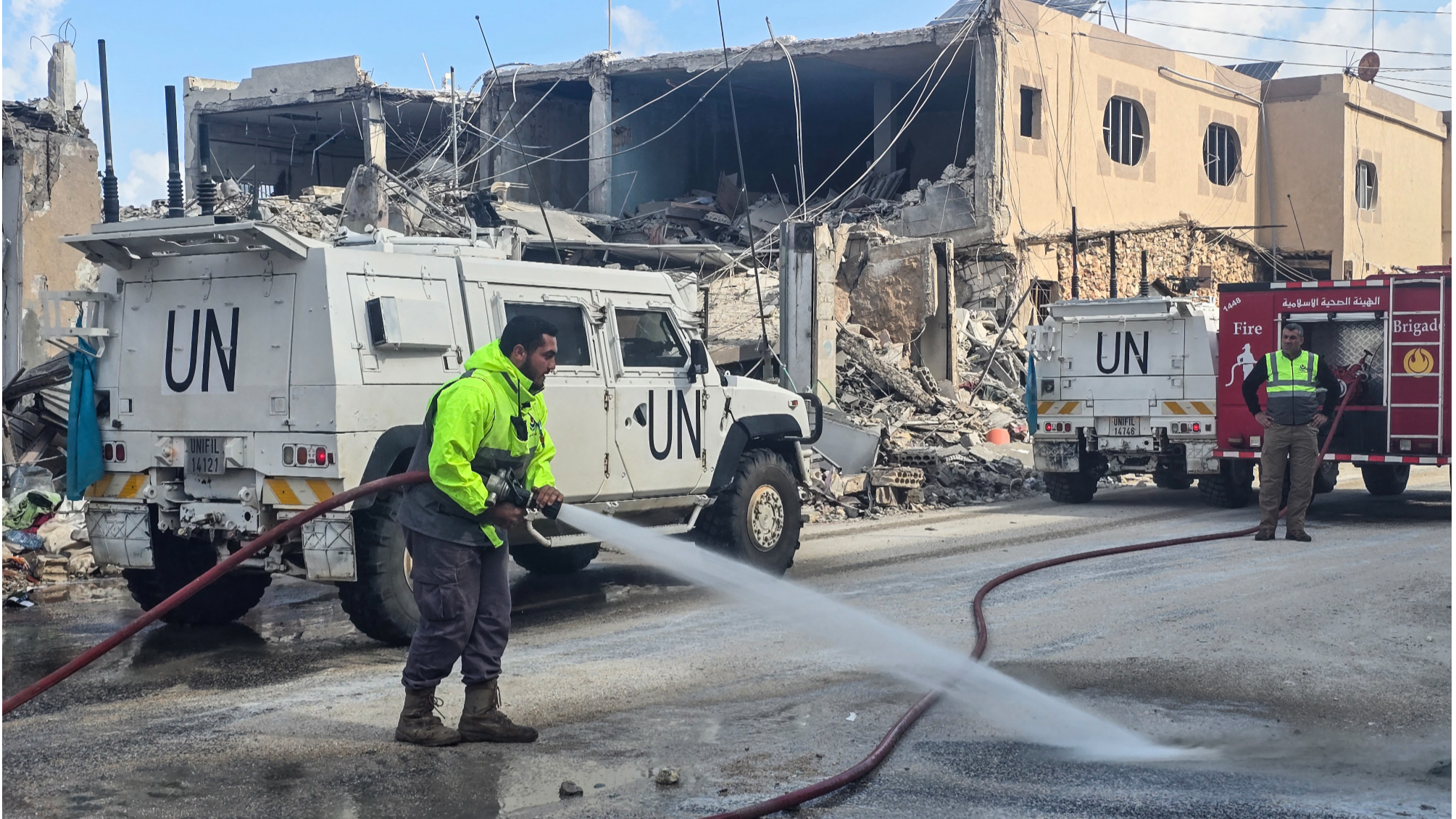 In this file photo dated March 27, 2026, UN peacekeepers with the UN Interim Force in Lebanon drive past firefighters clearing the road at the site of an overninght Israeli airstrike in the area of Naqura in southern Lebanon. (PHOTO / AFP)