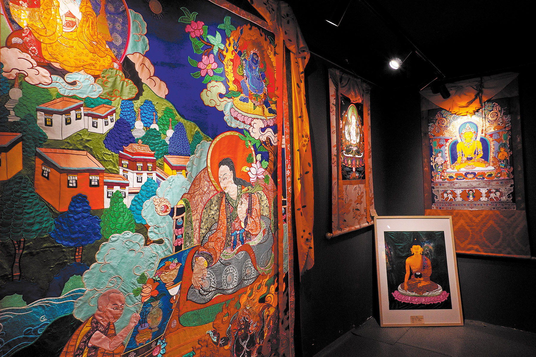 A basic applique thangka takes three to five months to complete. It involves more than 10 precise steps, from preparing the base and selecting materials to matching colors, cutting shapes, stitching, layering and final ironing.
