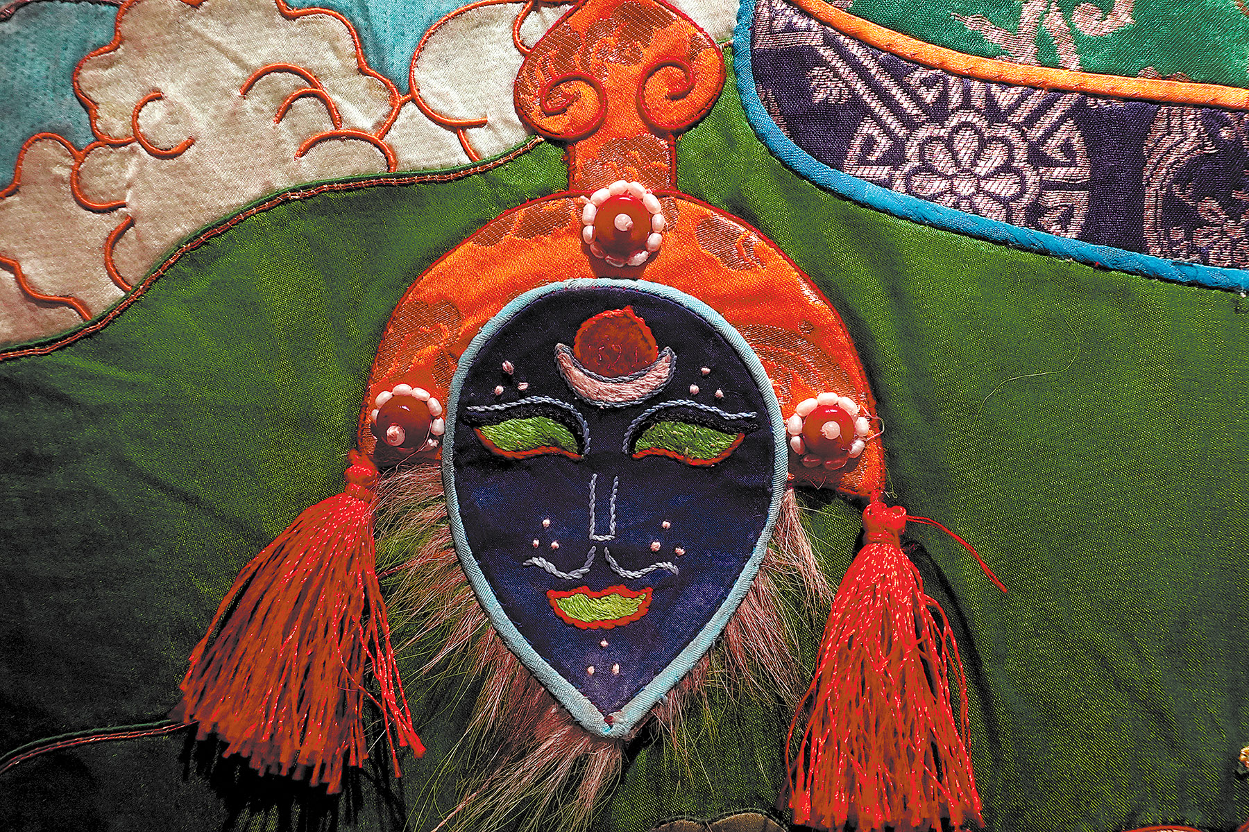 A distinctive art form of the people of the Xizang autonomous region, the applique embroidery combines folk handicrafts with painting techniques. Unlike traditional thangka paintings, it uses silk, brocade and other fabrics cut and pieced together, then layered to create a three-dimensional effect, like a relief on cloth.