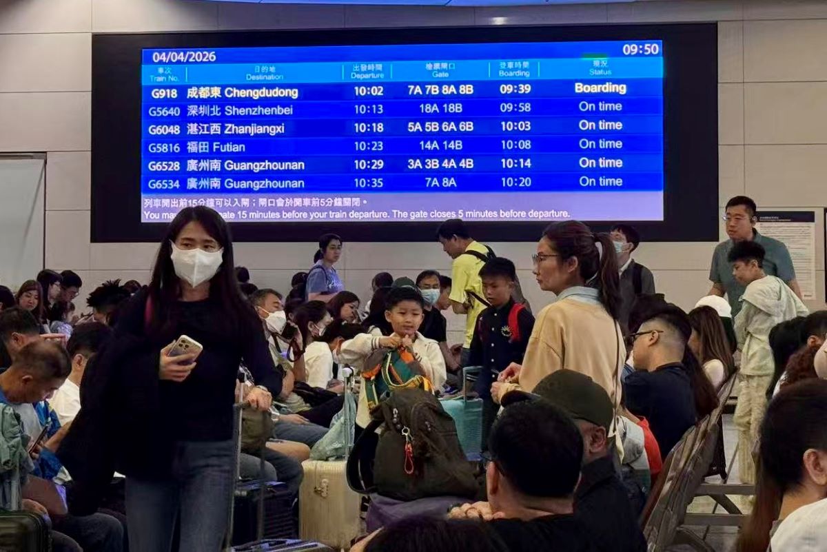 Travelers wait for high-speed trains at Hong Kong West Kowloon Station on April 4, 2026 morning, the second day of the five-day Easter break. (SHADOW LI / CHINA DAILY)