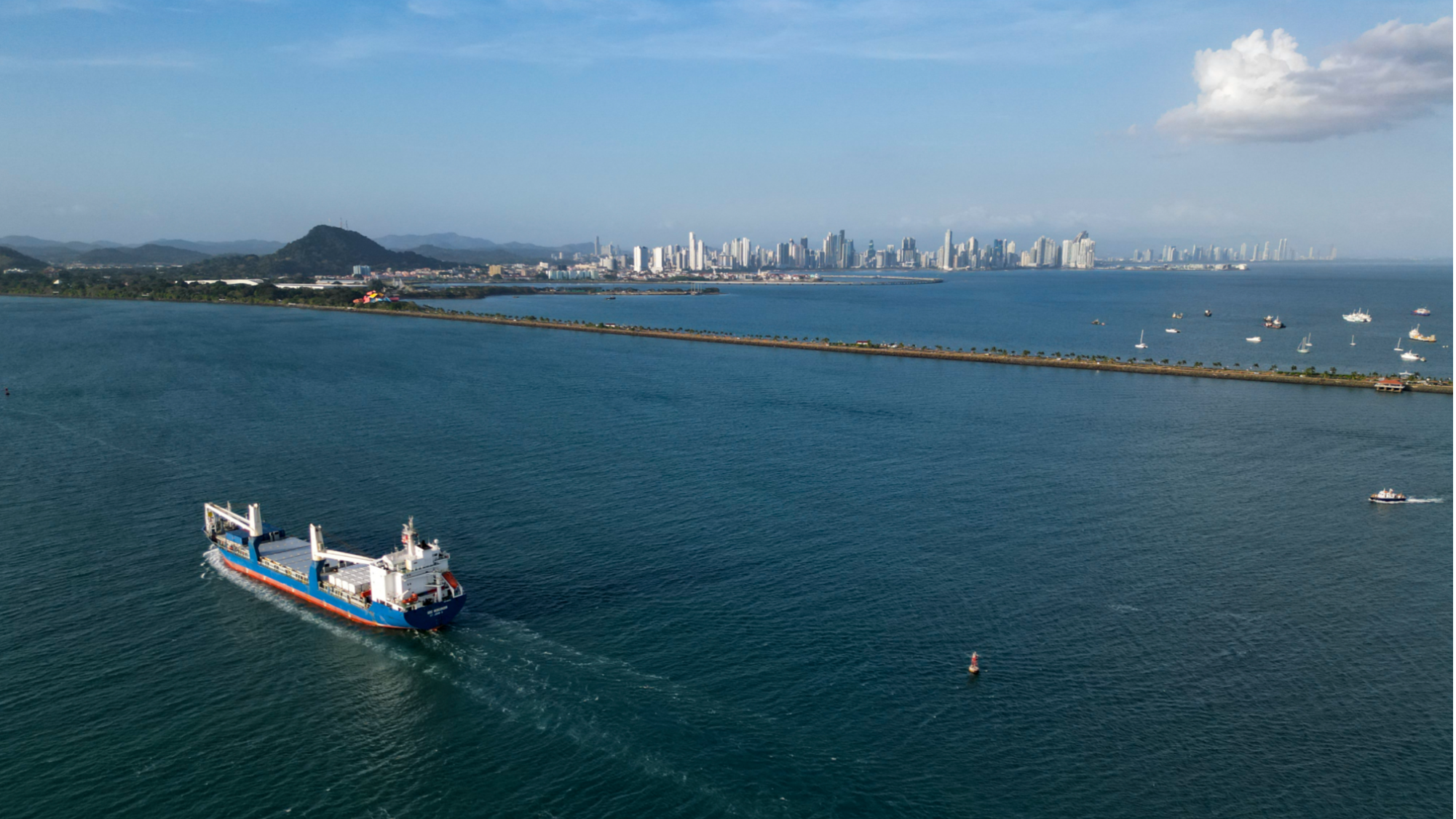 In this aerial view a cargo ship enters the Panama Canal on the Pacific Ocean side in Panama City on Feb 4, 2025. (PHOTO / AFP)
