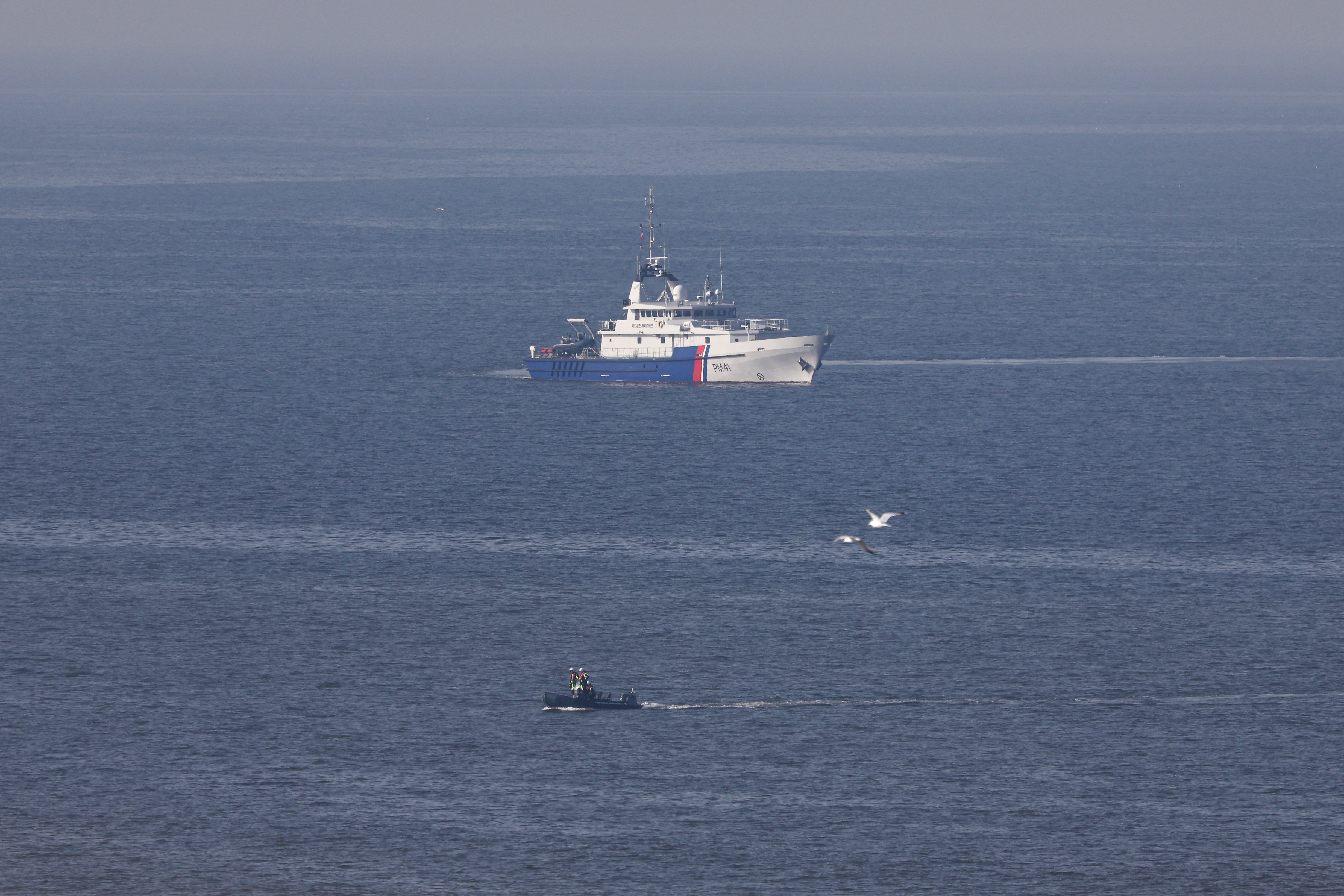 A vessel from the Maritime Affairs Department is sailing off France's Pas-de-Calais northern coastal city of Equihen-Plage after an attempt to cross the English Channel illegally turned tragic with several migrants found in cardiac arrest, on April 9, 2026. (PHOTO/AFP)