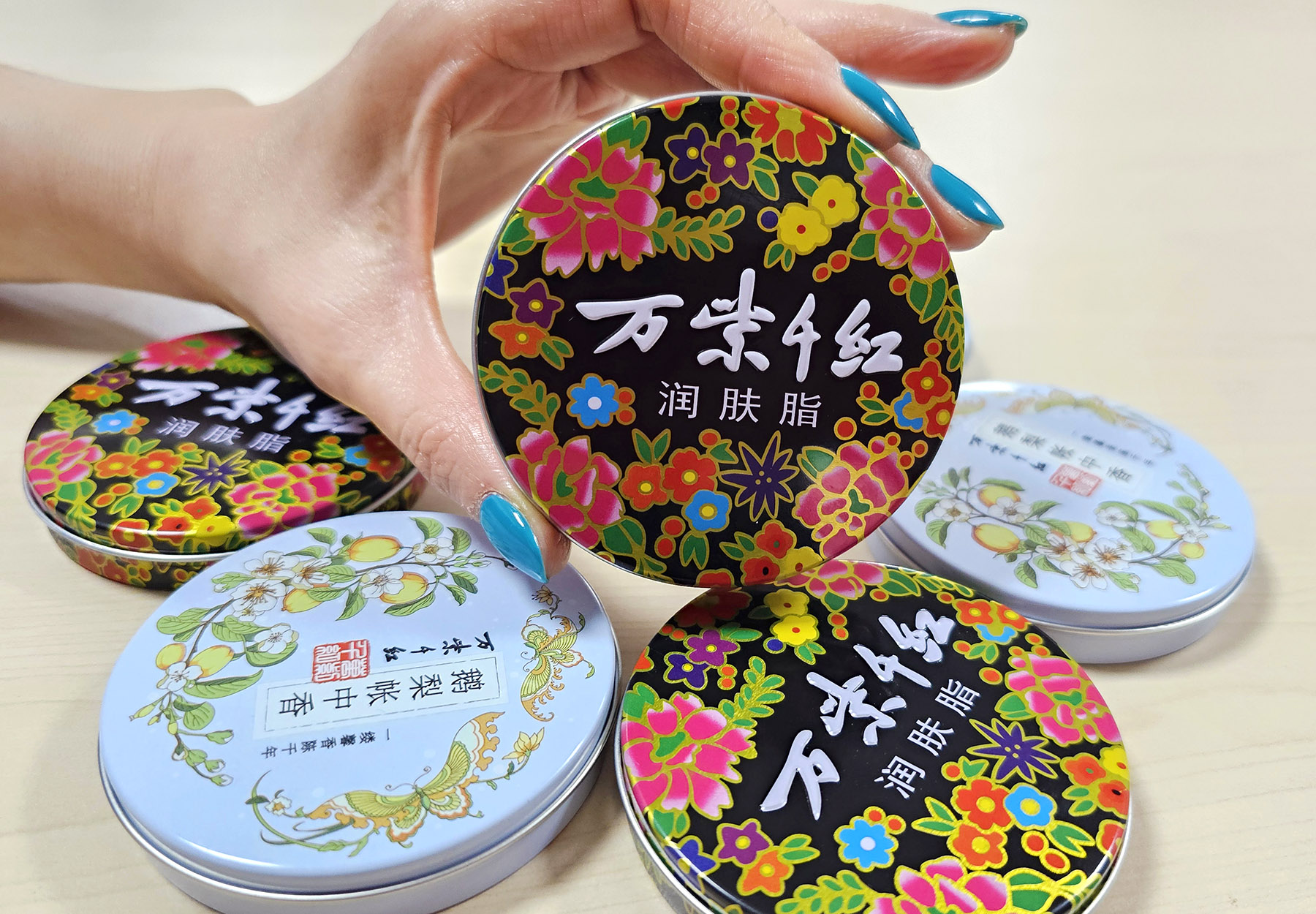 A tin of moisturizing cream by Chinese brand Wan Zi Qian Hong is displayed. (GENG FEIFEI / CHINA DAILY)