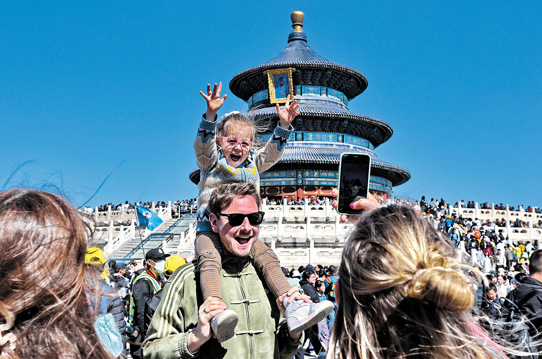Tourists take photos in front of the Hall of Prayer for Good Harvests at the Temple of Heaven Park in Beijing on April 5, 2026. (WANG XIN / FOR CHINA DAILY)