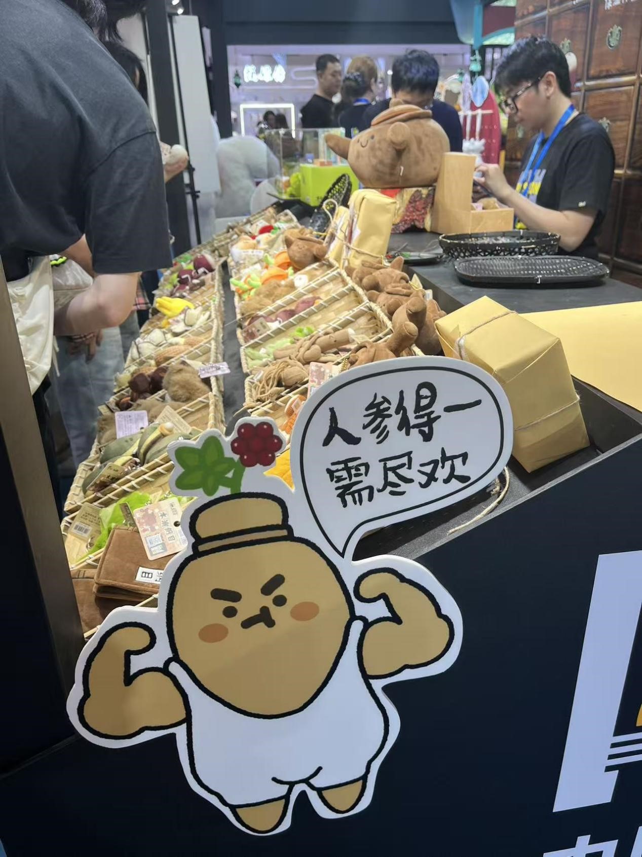 The Guangdong Hayidai Toys Co., Ltd. is exhibiting its newly launched line of traditional Chinese herbal dolls, looking like a local take on Jellycat. Over 20 types of dolls are on display, including those shaped like mugwort, ginseng, and goji berries, some of which even smell like their respective herbs.