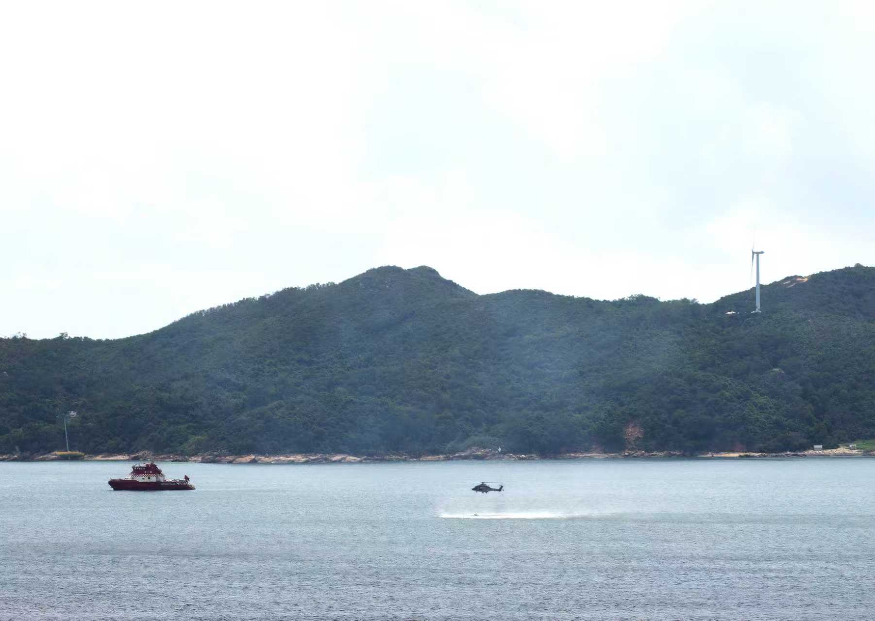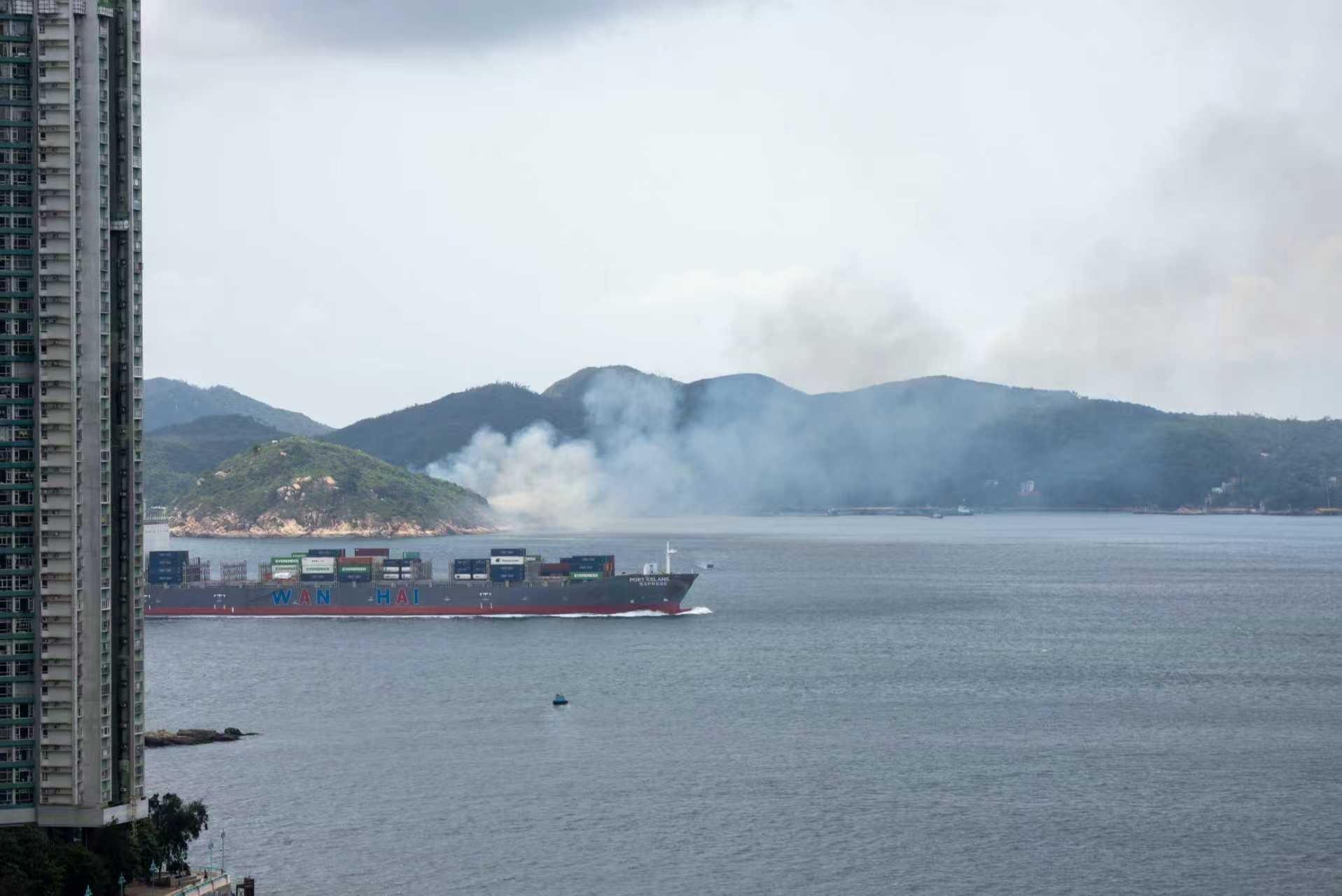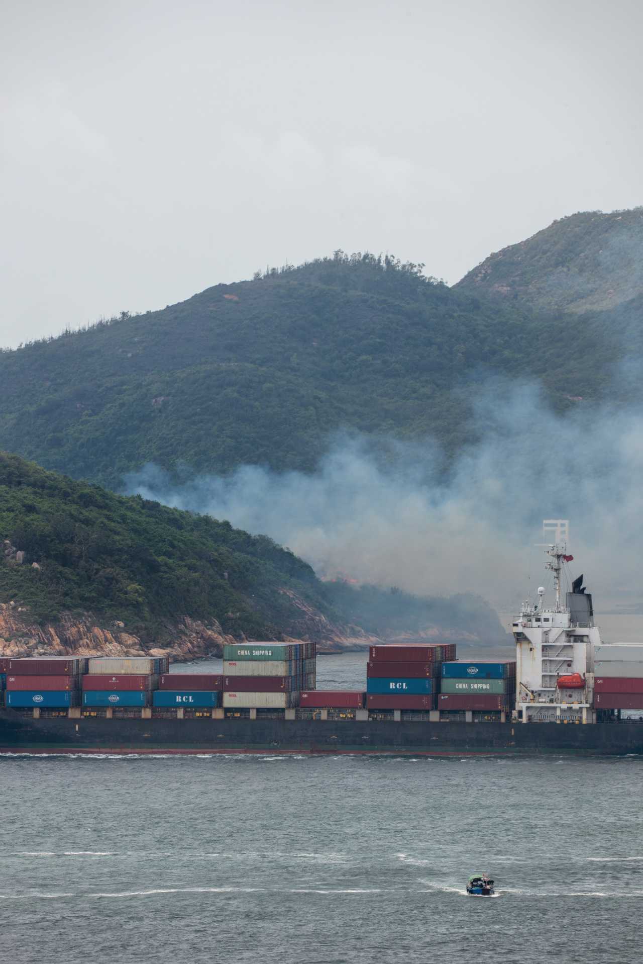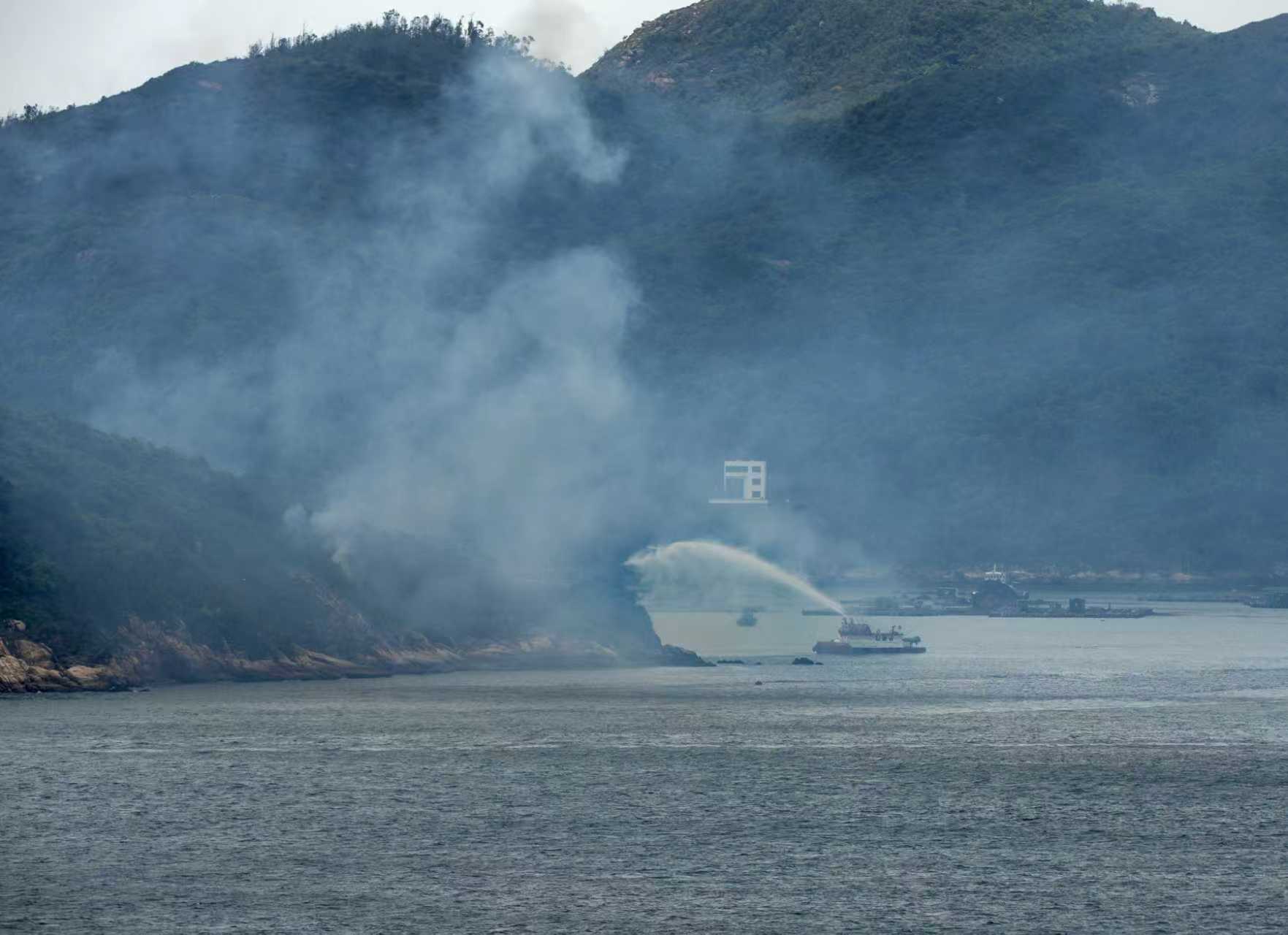 A fireboat was seen spraying water on the burning vegetation as white and grey smoke spread out from Luk Chau, which is just across Lamma Island.