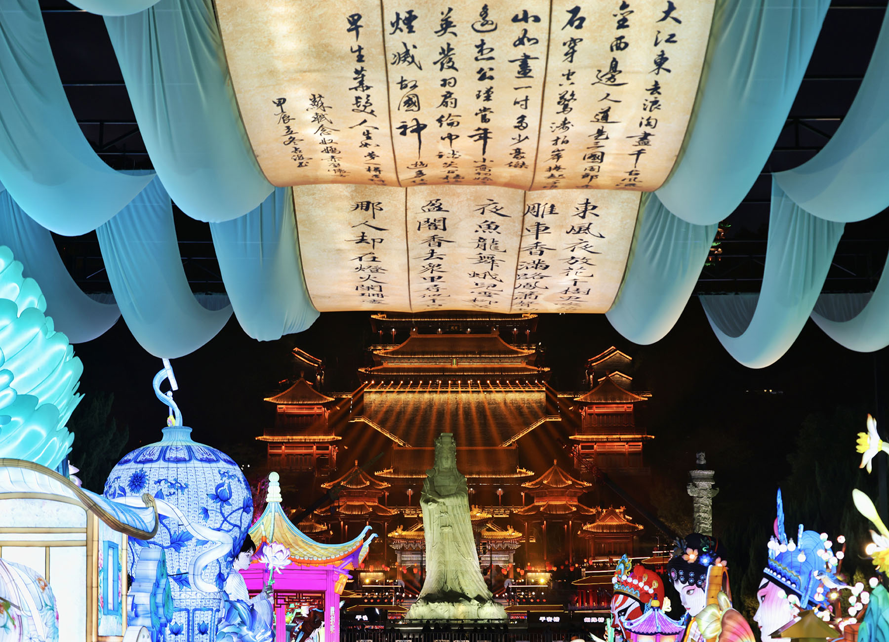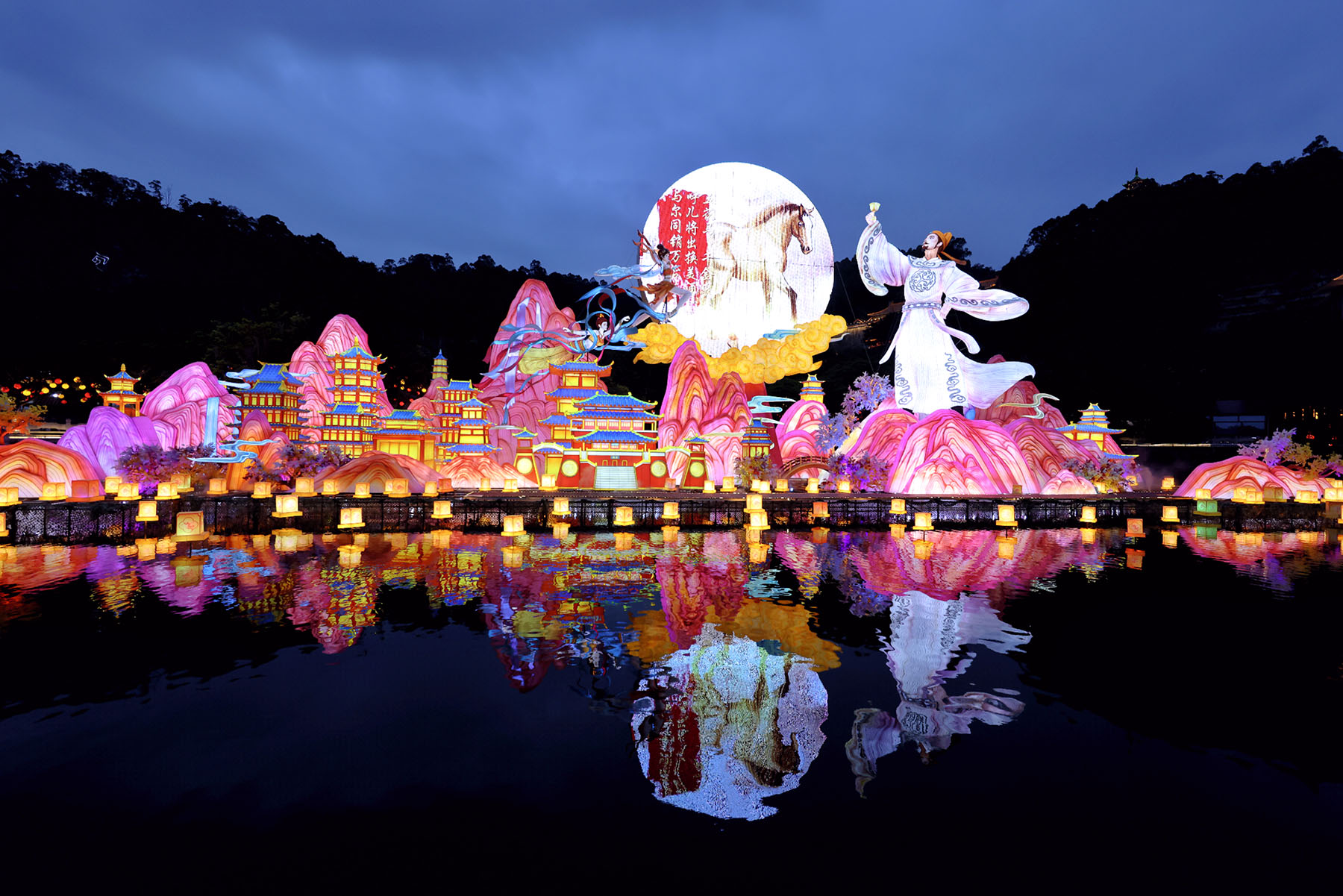 A grand lantern installation depicting “Li Bai Admiring the Moon” takes center stage at the 2026 Guangdong-Hong Kong-Macao Greater Bay Area Lantern Carnival on April 4, 2026. The 60-meter-long, 18-meter-high lantern features the poet Li Bai (701-762) raising a glass to the moon — a scene that inspired many of his most famous romantic poems. (PARKER ZHENG / CHINA DAILY)