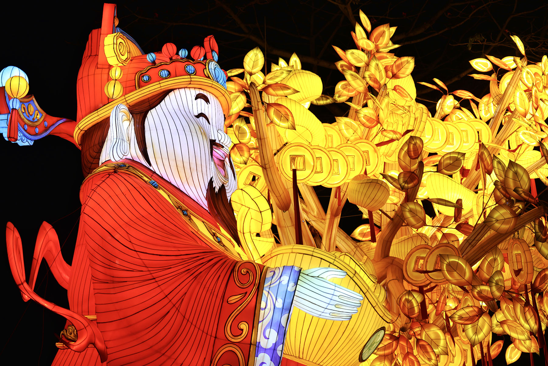 A lantern figure of the God of Wealth, part of the art installation Fortune Fills the Golden Branch, brings wishes of prosperity on April 4, 2026. (PARKER ZHENG / CHINA DAILY)
