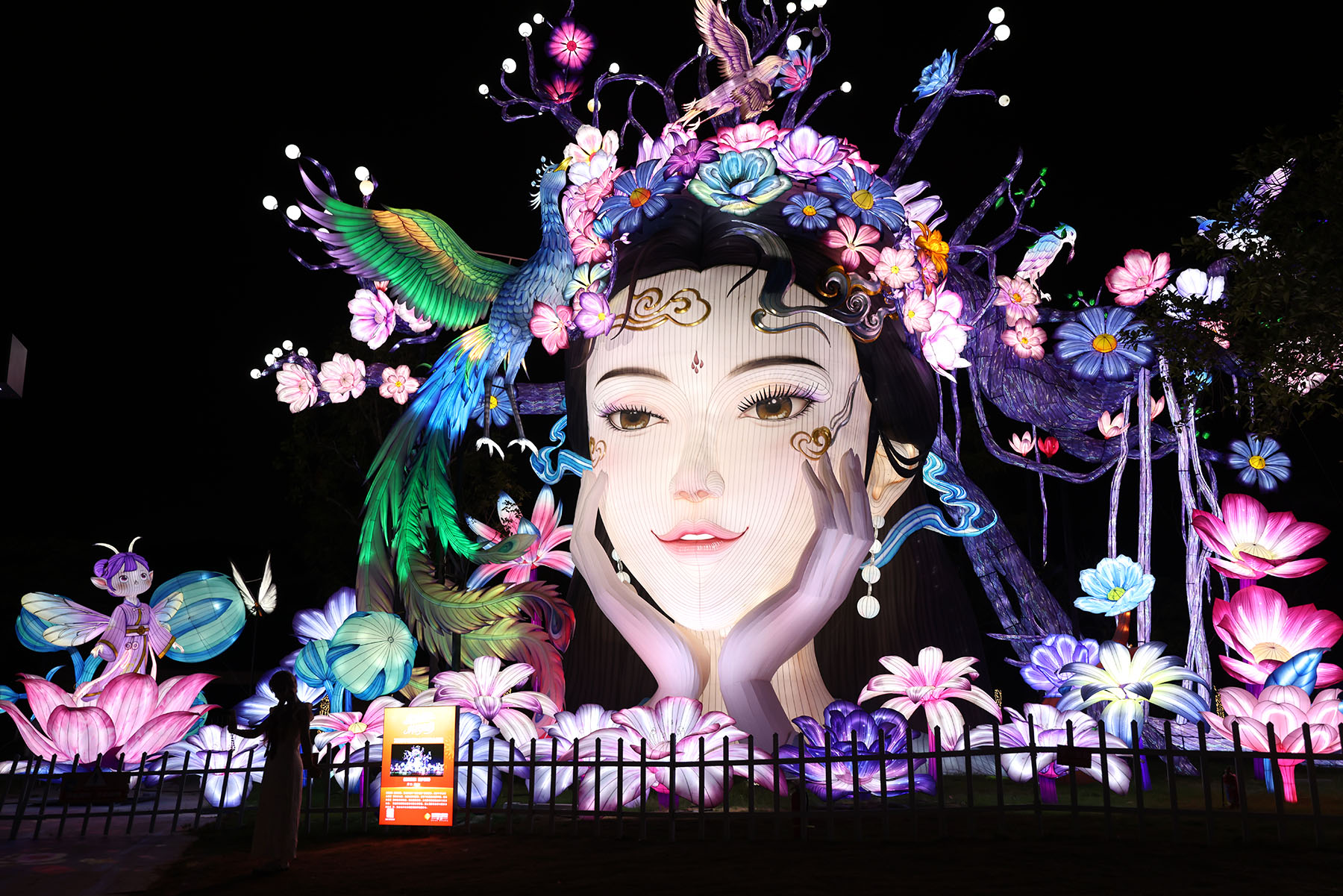 The 16-meter-tall lantern display The Flower Goddess Awakens displays vivid facial expressions with detailed technological effects on April 5, 2026. (PARKER ZHENG / CHINA DAILY)