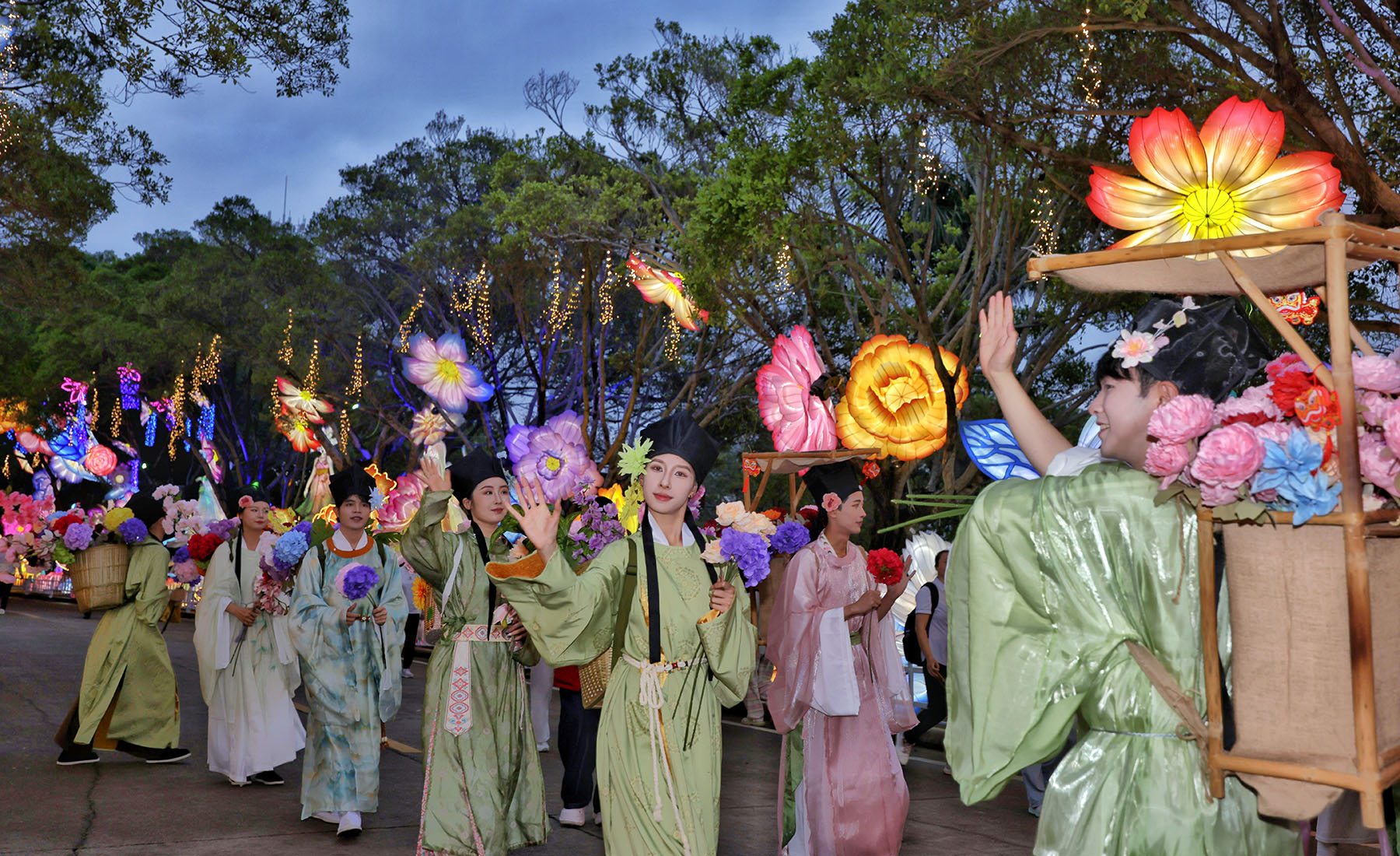 Performers in traditional attire parade with flower-shaped lanterns through Binhai Park on April 5, 2026. (PARKER ZHENG / CHINA DAILY)