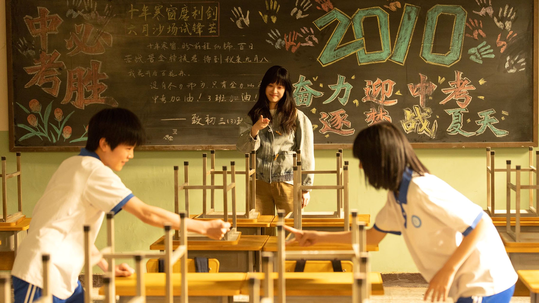 Actress Dong Jie, who stars as a middle school teacher with a painful past, gifts her two most favored students a cherished pen that holds special meaning for her. (PROVIDED TO CHINA DAILY)