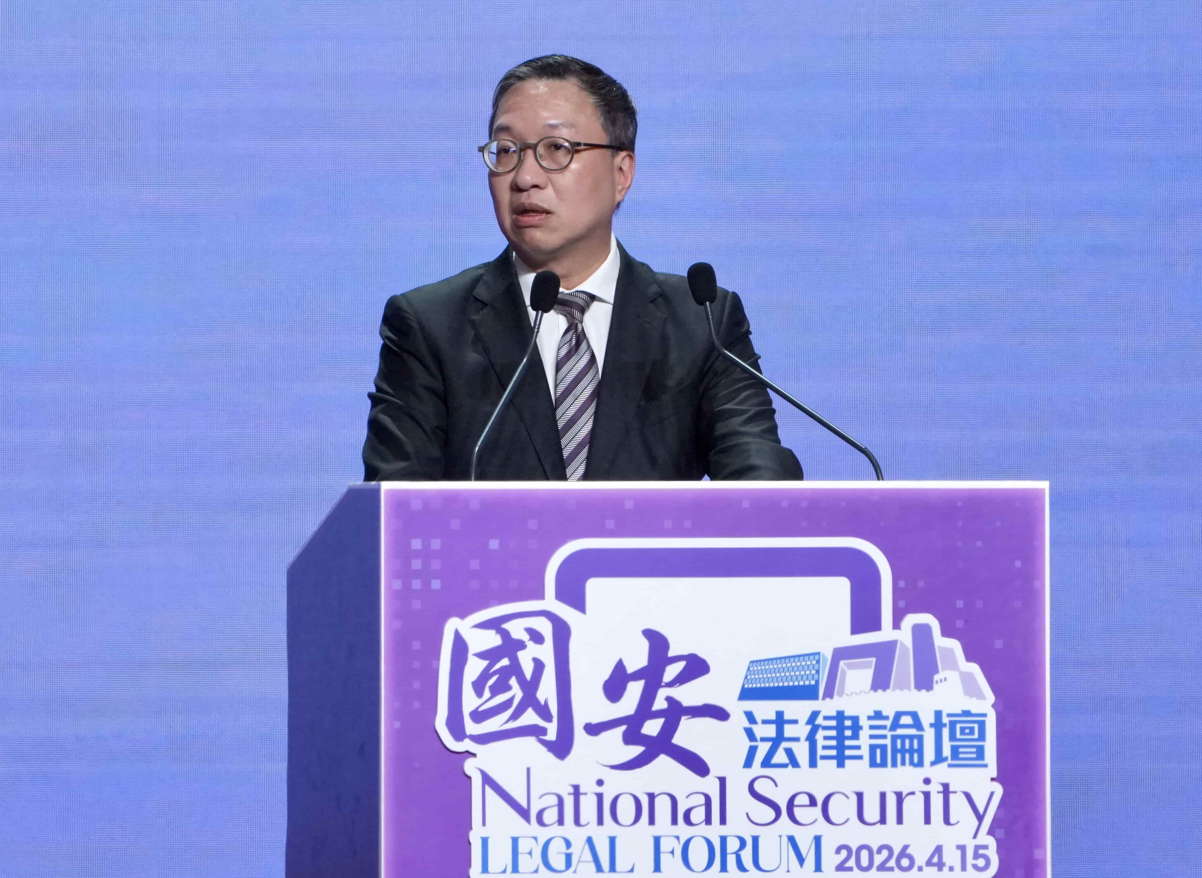Secretary for Justice Paul Lam Ting-kwok delivers a speech during the National Security Legal Forum at the Hong Kong Convention and Exhibition Centre in Wan Chai on April 15, 2026. (ADAM LAM / CHINA DAILY)