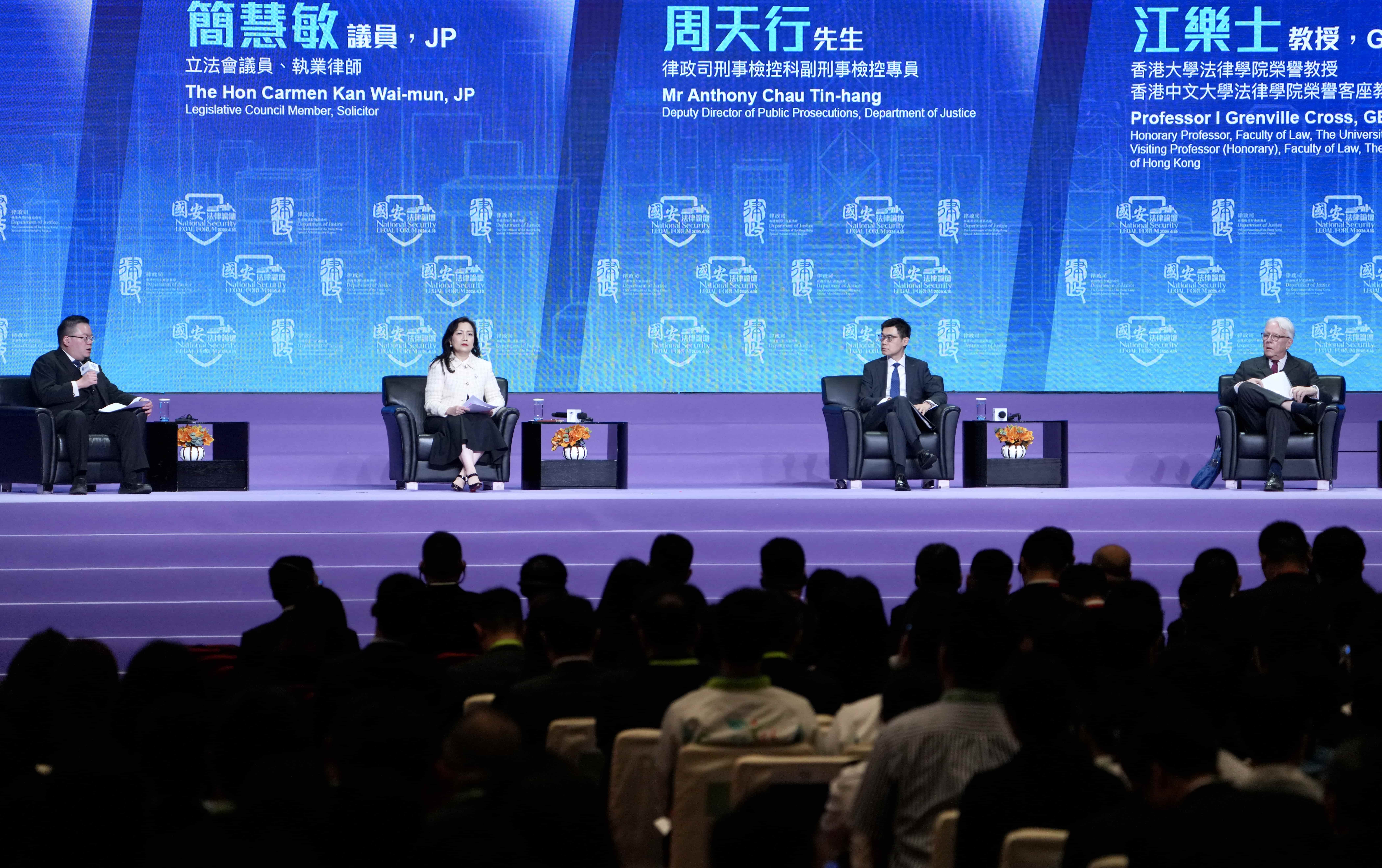 From left, Senior Counsel Jonathan Chang; Legislative Council Member Carmen Kan Wai-mun; Deputy Director of Public Prosecutions, Department of Justice Anthony Chau Tin-hang; Honorary Professor, Faculty of Law, The University of Hong Kong, Grenville Cross; attend a panel session during the National Security Legal Forum at the Hong Kong Convention and Exhibition Centre in Wan Chai on April 15, 2026. (ADAM LAM / CHINA DAILY)