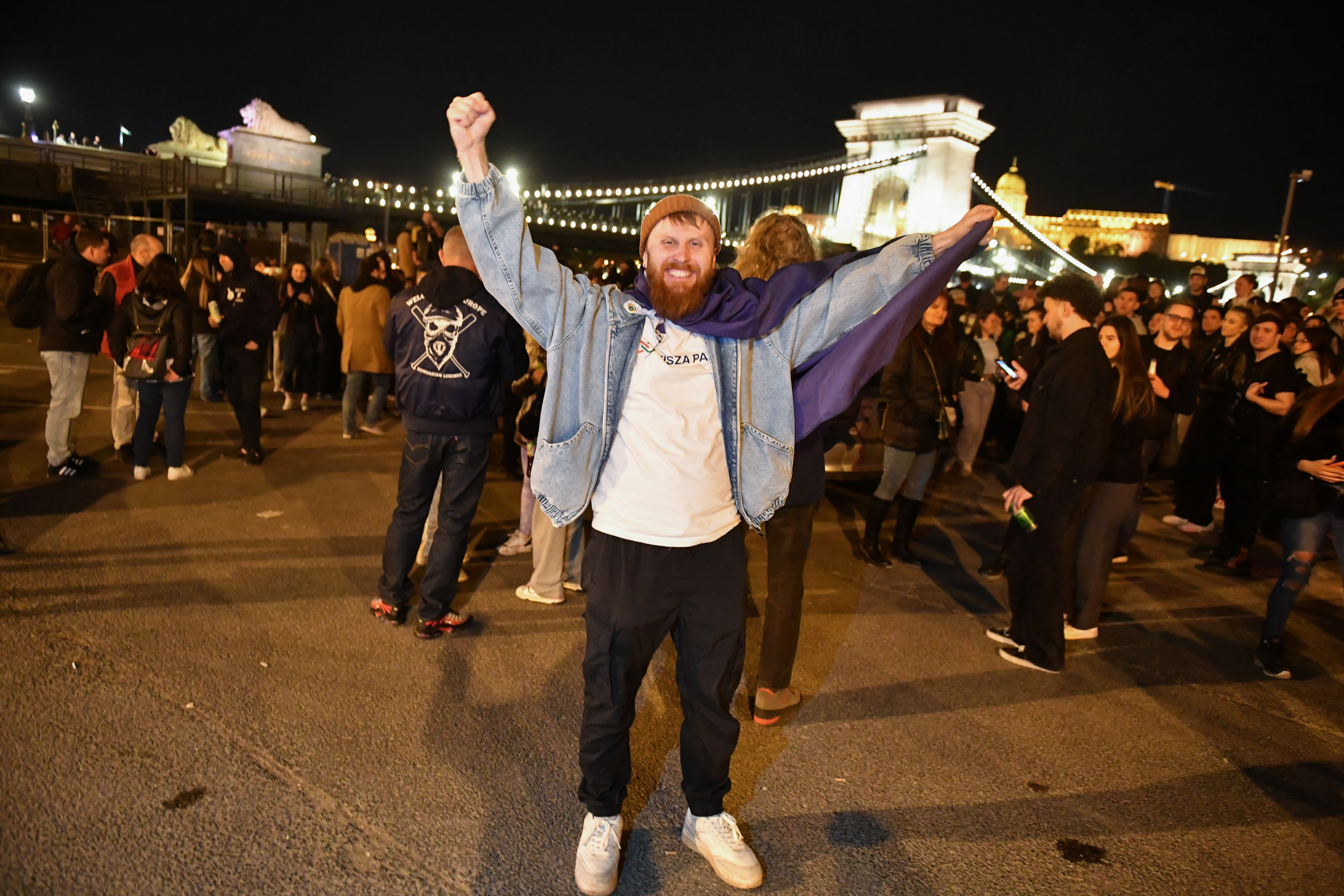 A participant cheers during a spontaneous gathering to celebrate the victory of the conservative Tisza party near the Szechenyi Chain Bridge in Budapest late on April 13, 2026, one day after Hungary's general elections. (PHOTO/AFP)