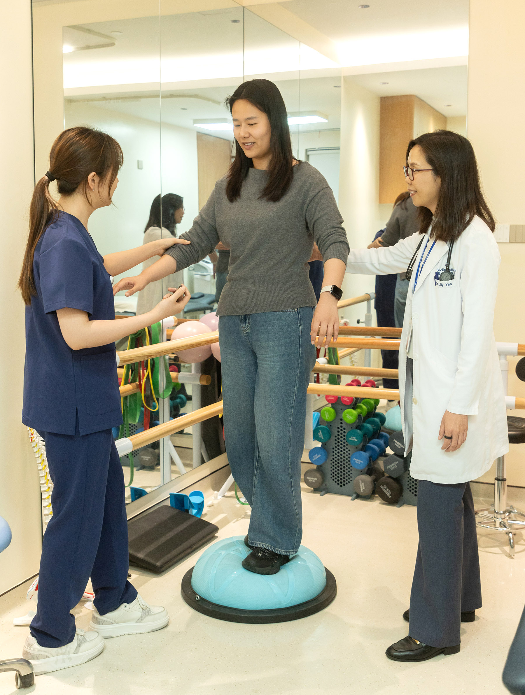 A woman in her 40s takes a balance test at the longevity clinic at SinoUnited Health in Shanghai on March 19, 2026. (GAO ERQIANG / CHINA DAILY)