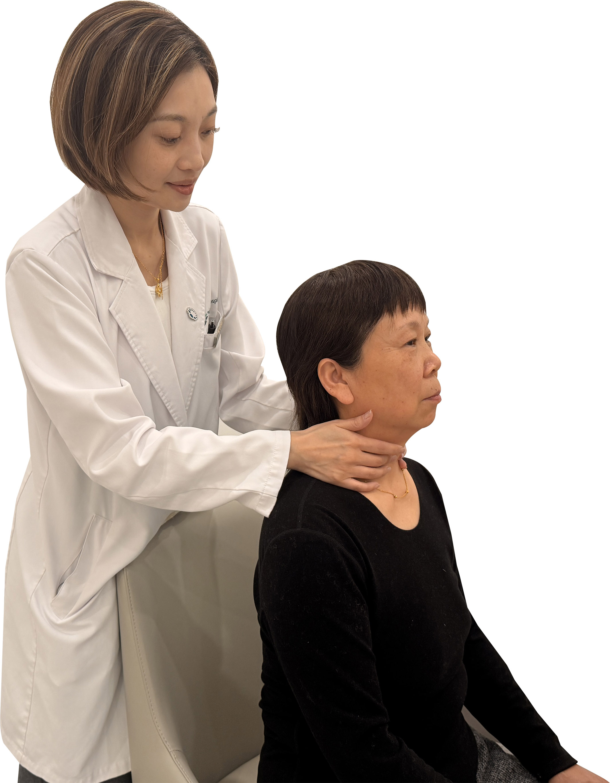 Wu Yihua (left), director of the silver age health center at Parkway Shanghai Hospital, assesses a woman on March 25, 2026. (PROVIDED TO CHINA DAILY)