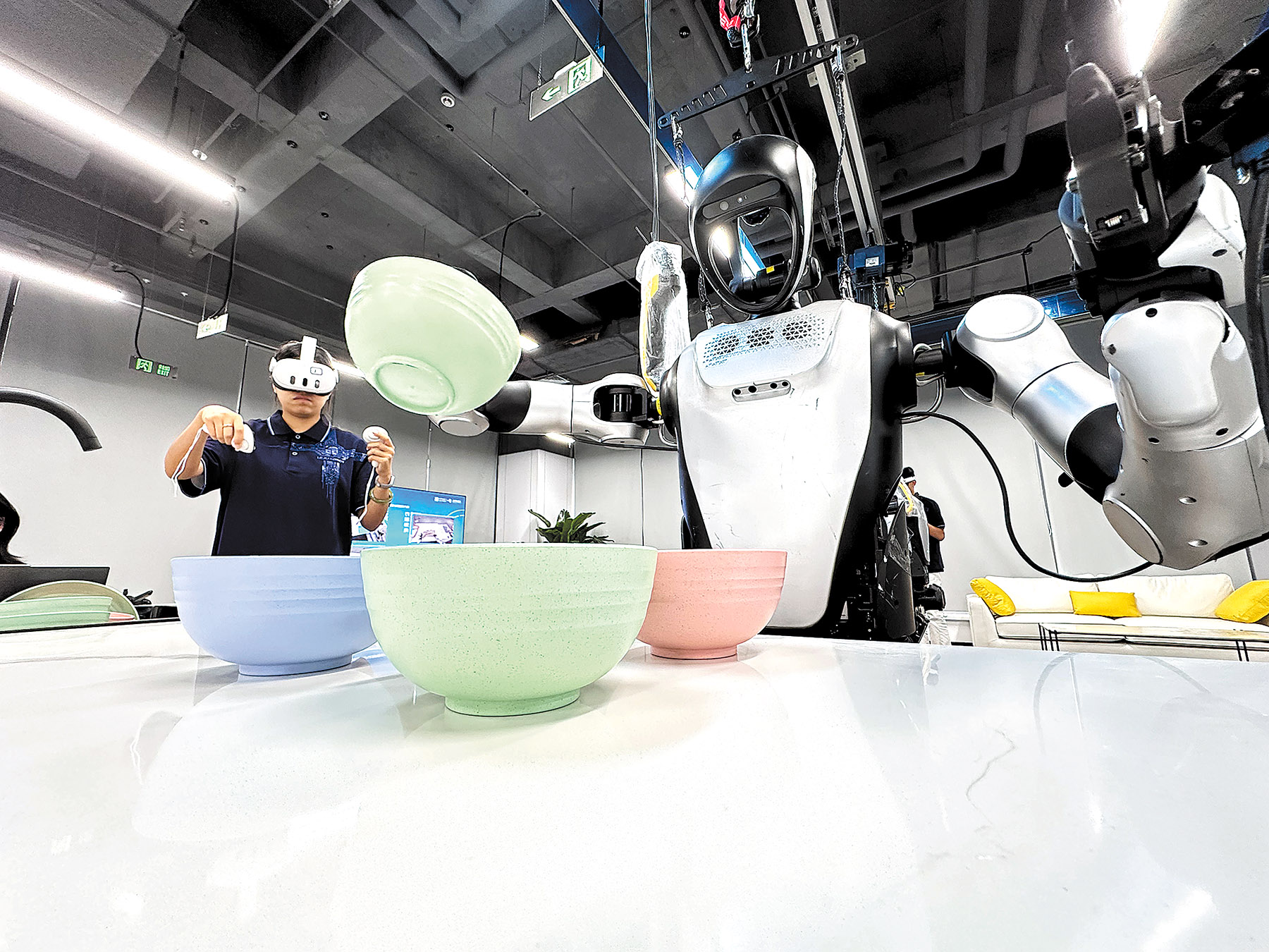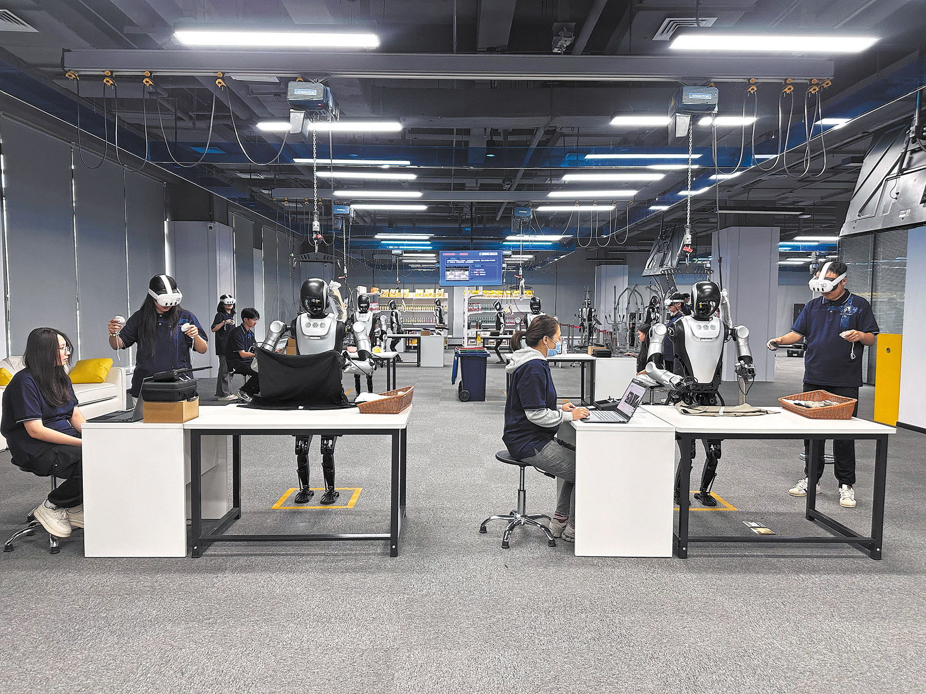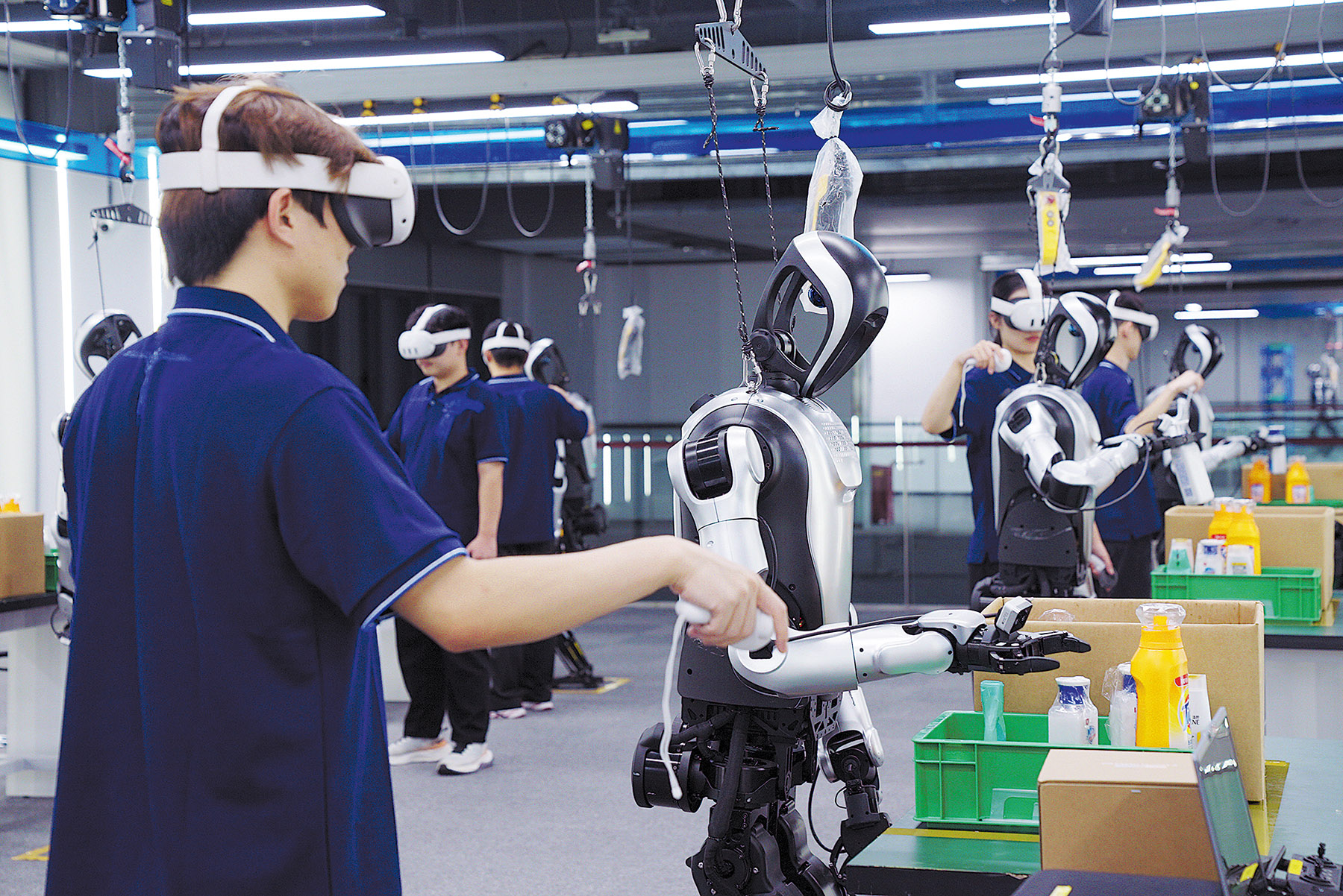 The instructors wear headsets, hold control levers, and move slowly, while nearby 1.66-meter-tall humanoid robots mirror their motions. The curriculum is relentlessly mundane. The students repeat everyday tasks such as taking a medicine bottle from a cabinet, carrying goods in a factory, sorting parcels on a conveyor belt, and leafing through office files.