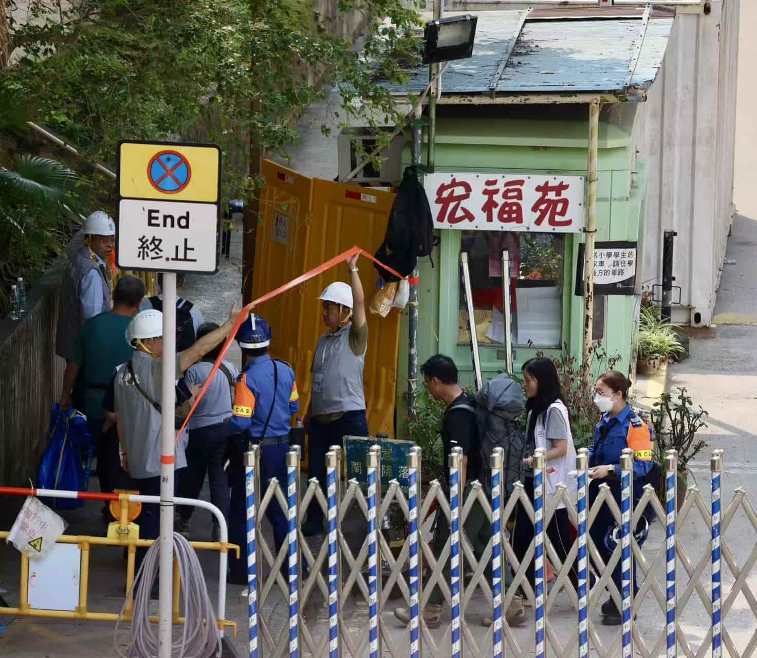 Some registered residents from Wang Sun House of Wang Fuk Court, accompanied by government personnel, leave after collecting their belongings from the fire-ravaged residential block, in Hong Kong's Tai Po district on April 20, 2026. (EDMOND TANG / CHINA DAILY)