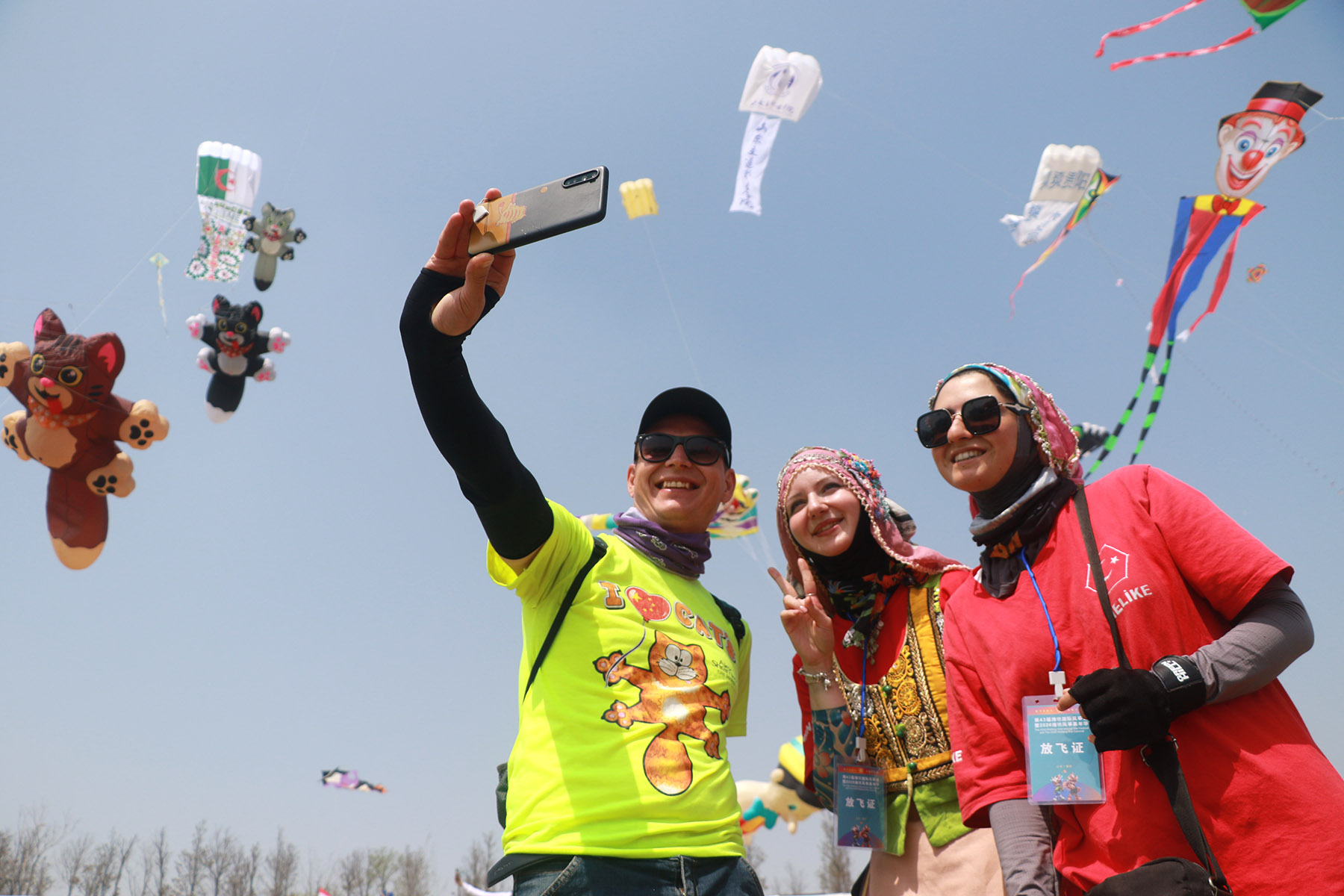 International kite enthusiasts take a selfie during a mass kite-flying event at the 43rd Weifang International Kite Festival in Weifang, Shandong province, on April 18, 2026. (LI HAITAO / FOR CHINA DAILY)