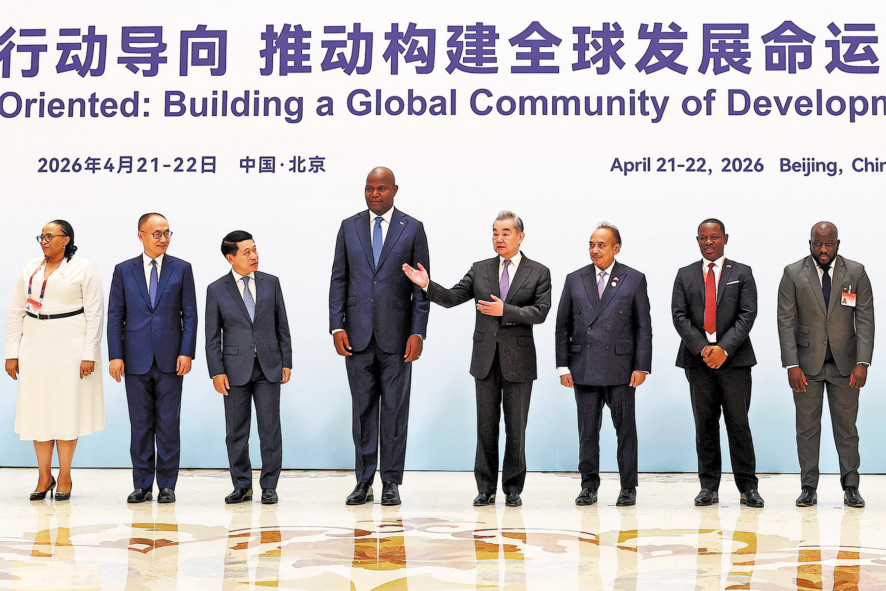 Foreign Minister Wang Yi (fourth from right) interacts on April 22, 2026 in Beijing with guests attending the third High-Level Conference of the Forum on Global Action for Shared Development. (WANG ZHUANGFEI / CHINA DAILY)
