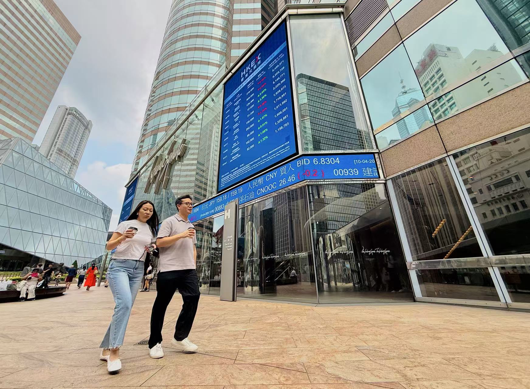 People walk in front of the Exchange Square, which houses Hong Kong Exchanges and Clearing Ltd, in the Central financial district of Hong Kong, April 10, 2026. (SHAMIM ASHRAF / CHINA DAILY)