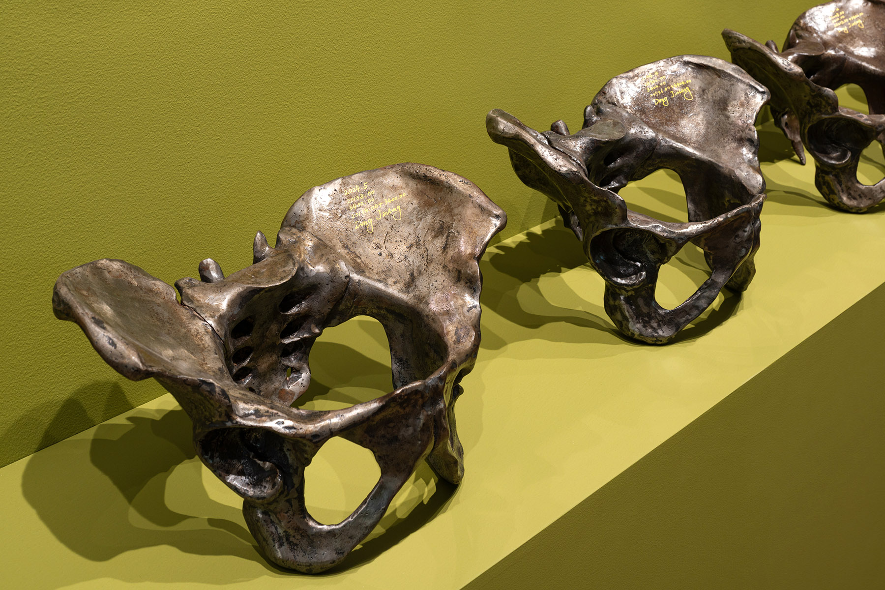 In Dong Jinling’s Workers (2023-24), women laborers are represented in the form of pelvic structures, sculpted in metal. The artist worked as part of different factory settings and supply chains, before commissioning factory workers to fabricate the sculptures. The value of the metal used for each piece in the series is directly proportional to the money its maker earned in terms of wages the week the sculpture was made. The production date, the maker’s salary, fabrication costs and market price of the product are stamped on the metal.