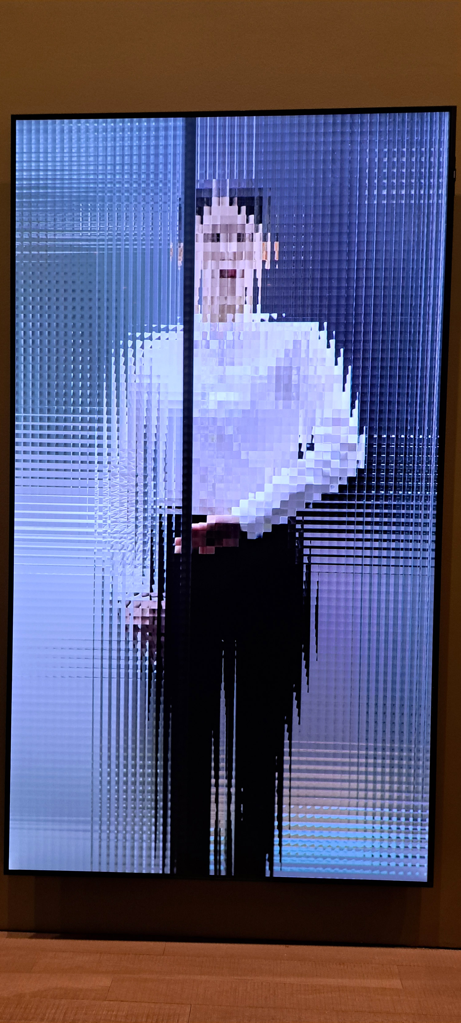 Around two dozen artworks feature in a salon-wall-style display as part of the Stay Connected: Supplying the Globe exhibition at JC Contemporary in Tai Kwun. These are mostly traditional media works, with the exception of Joyce Ho’s video installation, Behind the Scene (2022), in which a woman dressed in the standard hospitality-sector garb of white shirt and black trousers, continuously slides the glass partition separating her from the viewer. Her face morphs into different shapes behind the mosaic glass screen, but remains unreadable — for she is a cog in the wheel of an enormous service-industry collective.