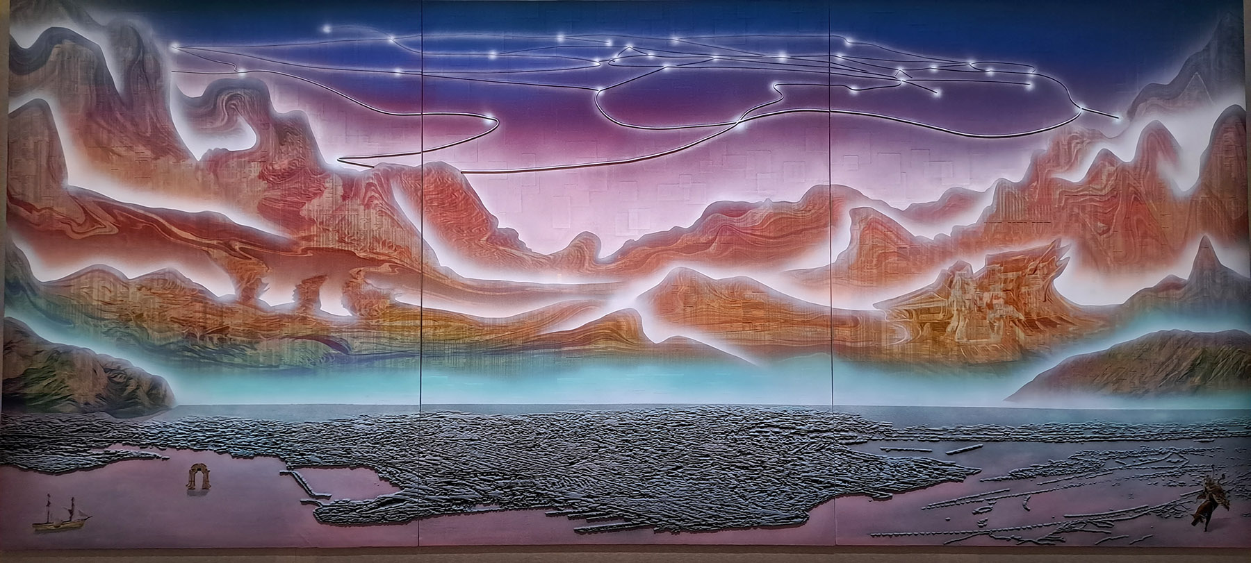 Gordon Cheung’s multimedia collage spans a huge swathe of history, visualizing the trade routes in China’s Belt and Road Initiative as interconnected constellations. (PROVIDED TO CHINA DAILY)