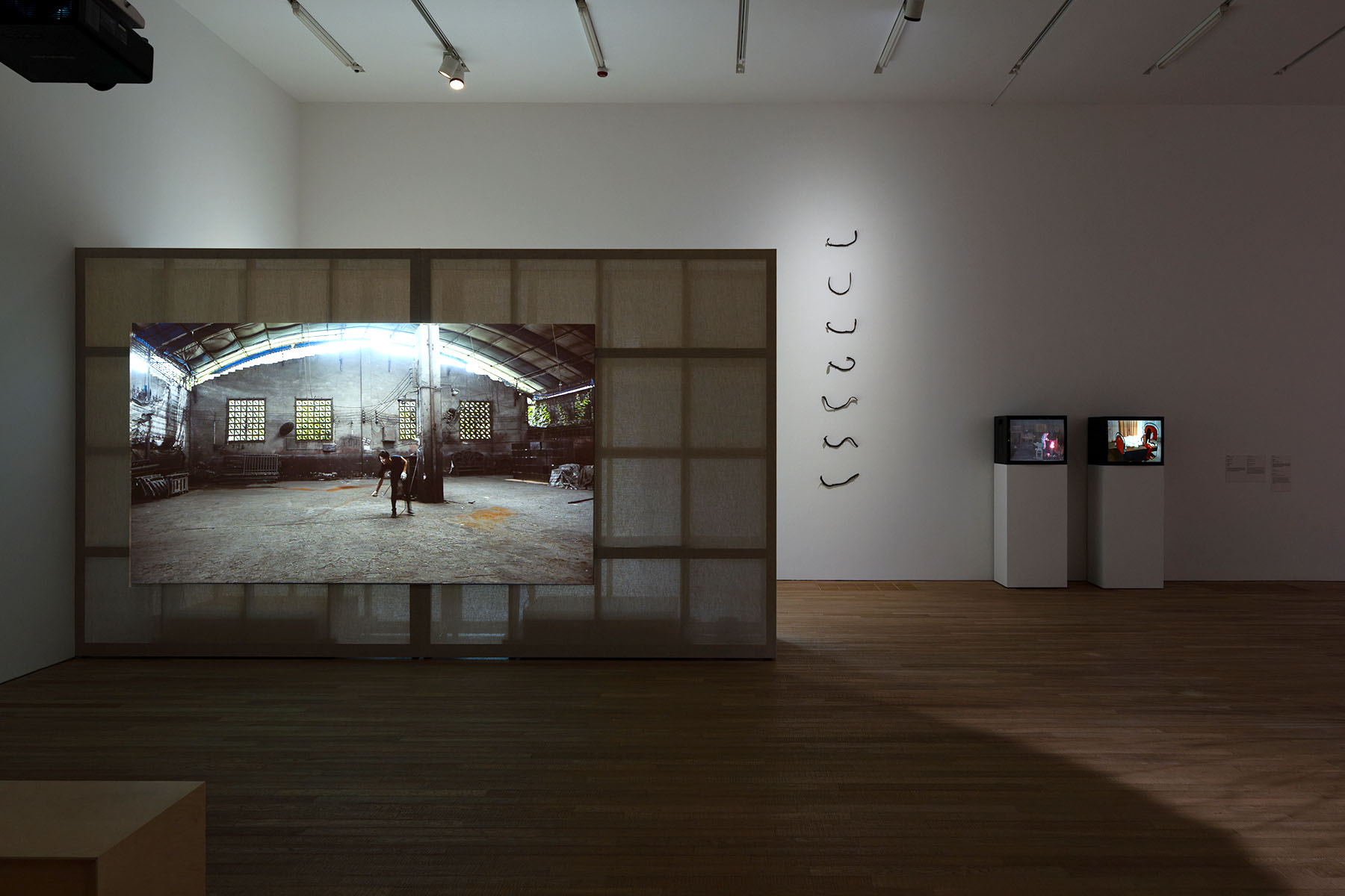 Cruz Bacani was a domestic helper in Hong Kong before she famously won the Magnum Foundation Human Rights scholarship to New York University. Hu Yinping, who is part of the Hu Xiaofang collective for women engaged in textile-based work in rural China, invited its members to tell their stories in the form of hand-crocheted tapestries, which are displayed like an upright, open book. The piece is called CV (2023-25). Tong Wenmin put herself through the wringer for her Factory Project series (2016). Three video installations provide a documentation of her attempts to perform tasks commonly associated with male laborers working in a metal foundry. We see Tong, a slightly built young woman, struggles trying to manipulate a metal strip, several times in length compared to her own height.