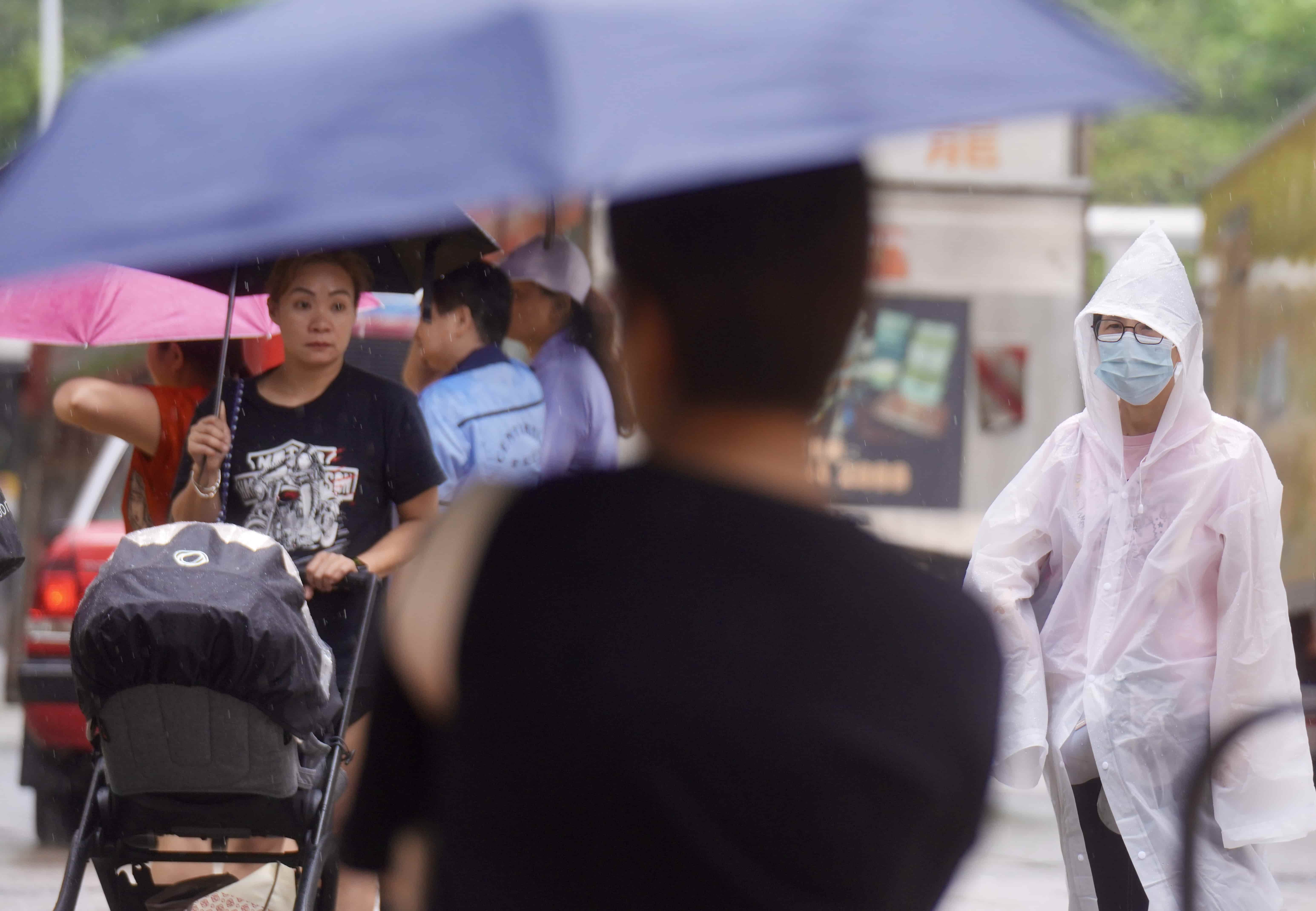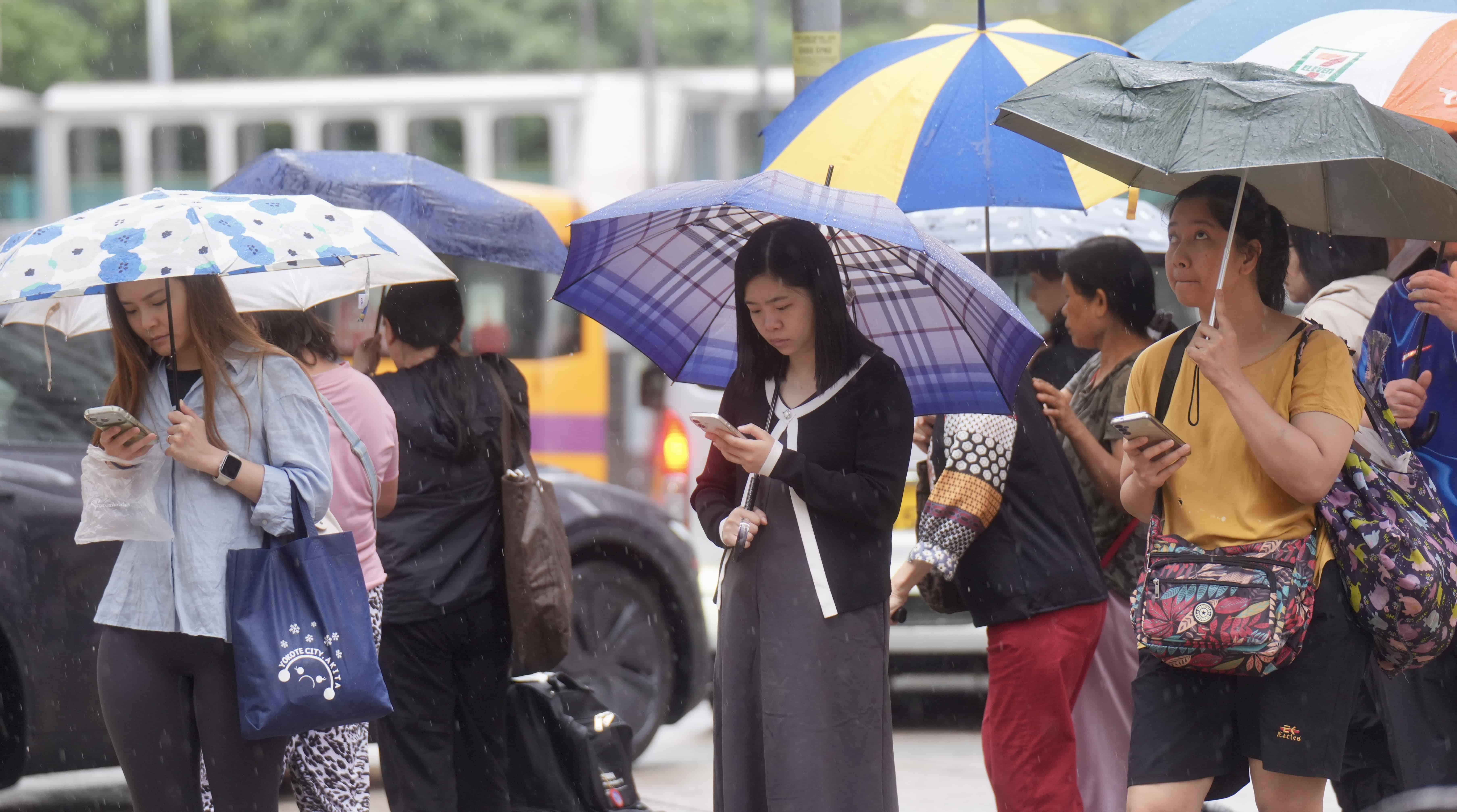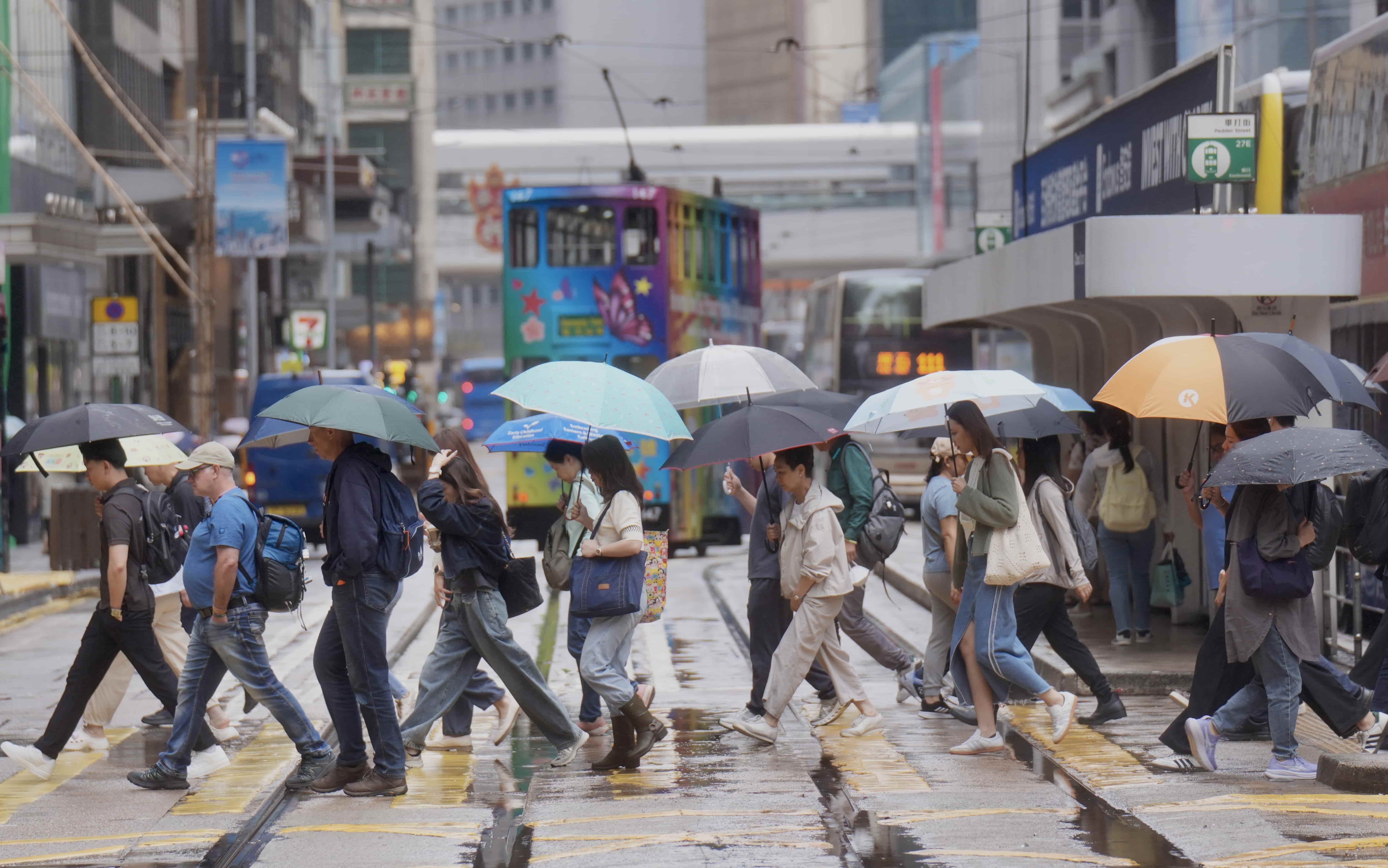 Residents walk in the rain in Quarry Bay on April 24, 2026. (ADAM LAM / CHINA DAILY)