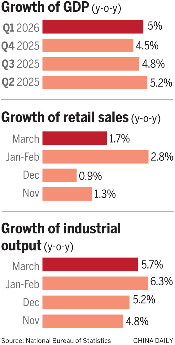 In total, consumption and investment accounted for 84.7 percent of first-quarter GDP growth, up nearly 30 percentage points year-on-year, the bureau said, pointing to a continued shift toward a growth model driven by domestic demand.