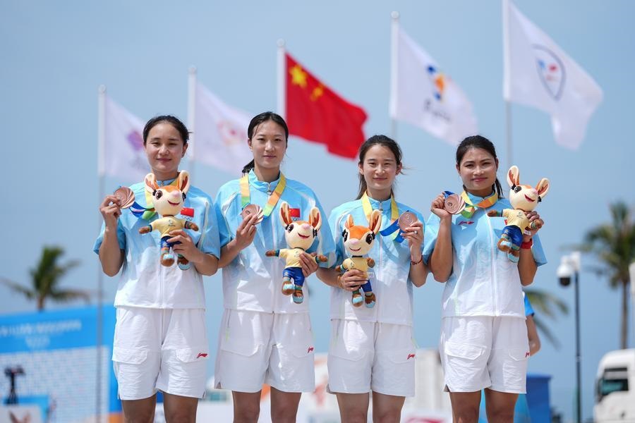 (From left) Bronze medalists Feng Lulu, Dong Yuehua, Zhou Jing and Li He of China pose for a photo after the women's 4x60m relay at the 6th Asian Beach Games in Sanya, South China's Hainan province, April 26, 2026. (PHOTO / XINHUA)