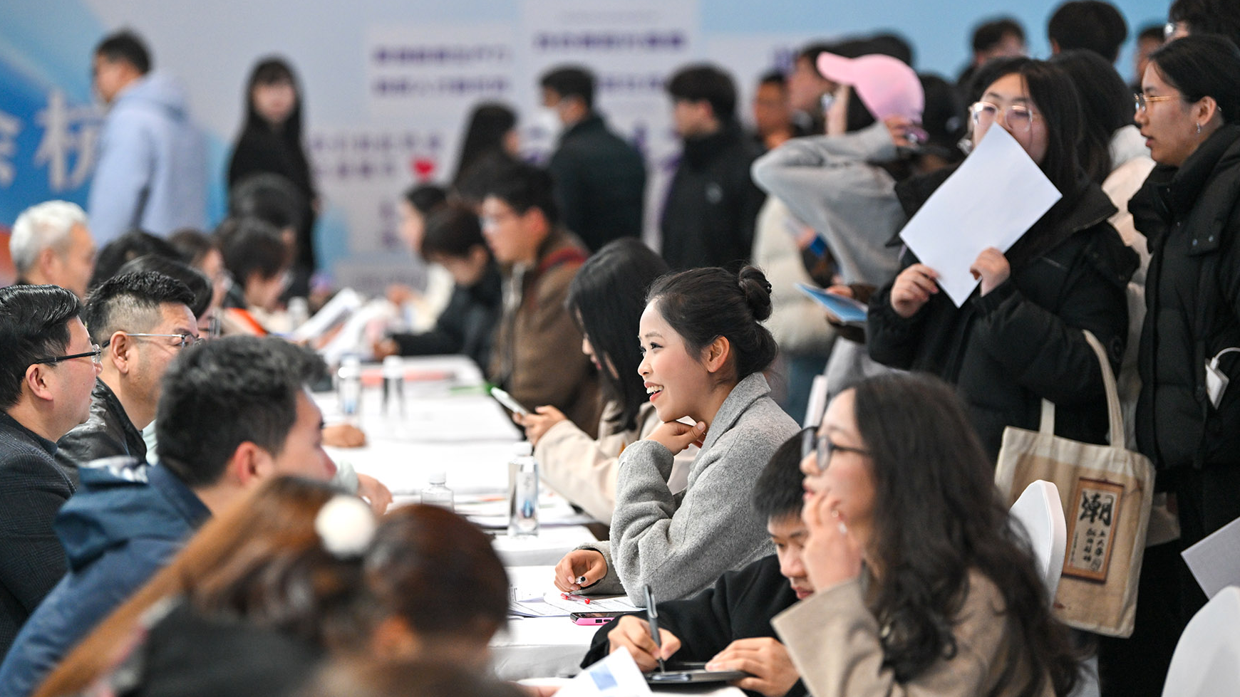 Job seekers consult with workers about the available posts at a job fair in Hangzhou, Zhejiang province, on March 10, 2026.(DONG XUMING / FOR CHINA DAILY)