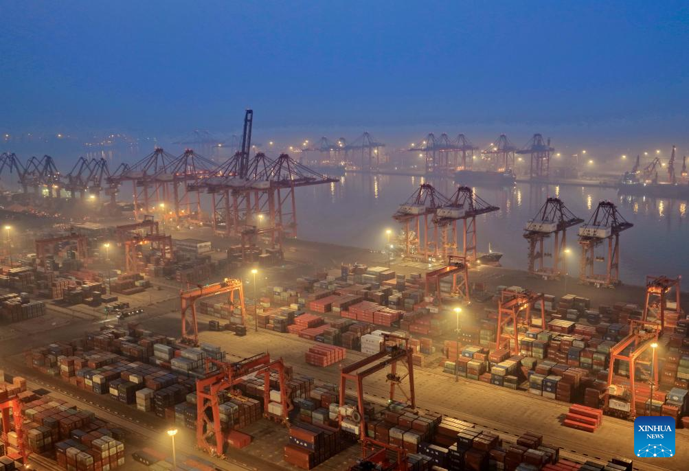 An aerial drone photo taken on April 18, 2026 shows a container terminal of the Jingtang area of Tangshan Port in Tangshan, North China's Hebei province. (PHOTO / XINHUA)
